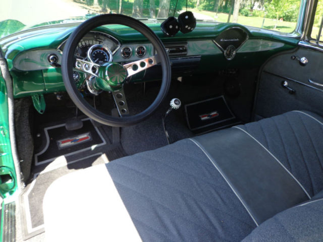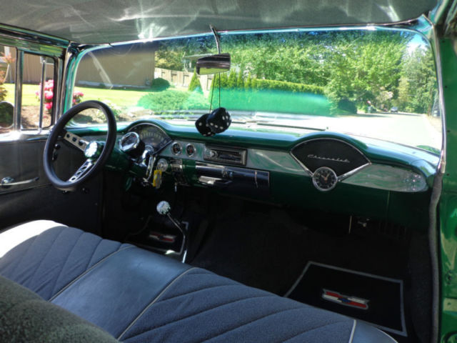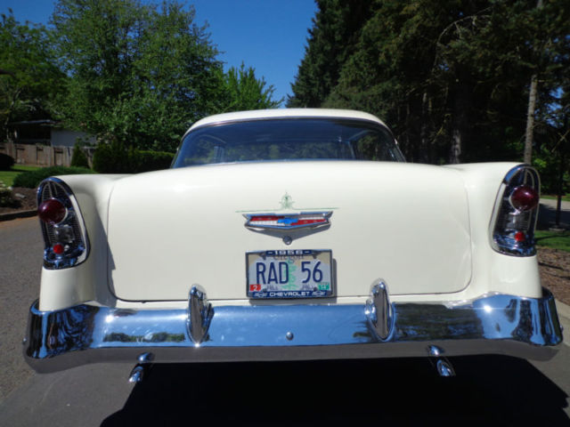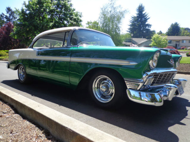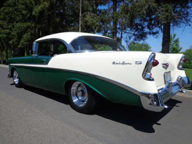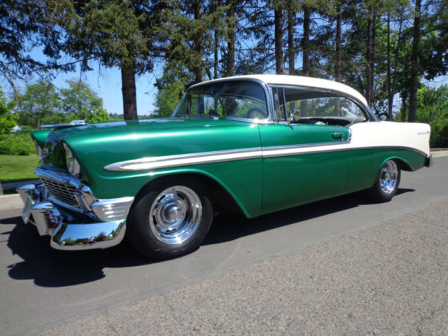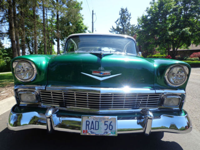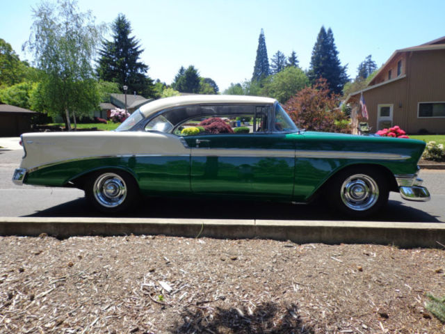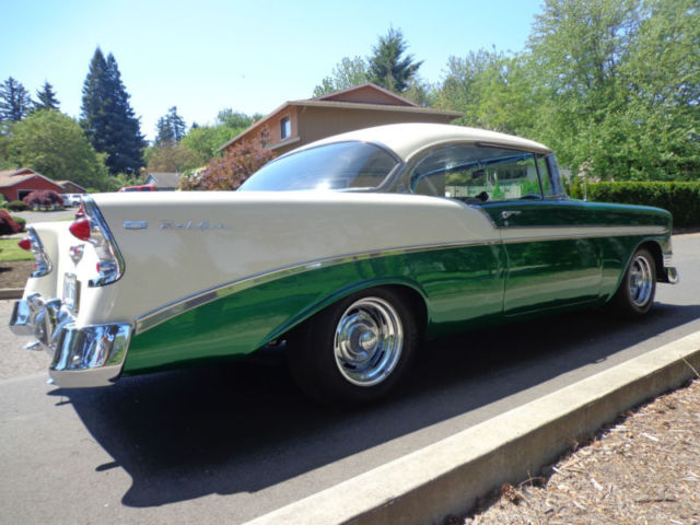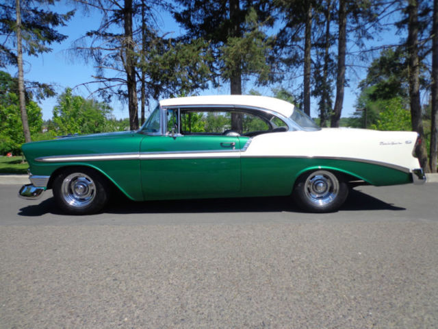 For your consideration...a tastefully modified 1956 Chevrolet Bel Air 2 door non-pillar (no post) hardtop offered at a buy it now with others offers for discussion. The beautiful vehicle is equipped with a 350 ci engine, 4 speed Muncie manual transmission, 12 bolt rear end, and chrome rally style wheels. I have owned this Bel Air for two years and have only put on 250 miles, as it has been in covered temperature controlled storage. This car runs and drives out very nice without issue. The car has a nice crunchy cam, great sound of dual exhaust, manual steering and drum brakes (you really canât tell they are drum brakes, as the brakes feel as good as discs). The '56 is very nicely presented in a green/white exterior with a nice gray fabric interior for a beautiful color blend combination. This car was recently restored using 2 different cars and this is why it has a reconstructed title and an assigned vin. # from Oregon. In Oregon, reconstructed title's are issued if the car is assembled from another donor car. Never in an accident...the restorer/owner used two '56 Bel Air's to make one beautiful car which is presented to you today. Restoration of over $9500 on the paint & body alone. It drives out perfect and straight down the road at 70 mph, doesnât pull, transmission shifts smoothly, and the 350 ci engine has plenty of power with a great sound of the dual exhaust. The car is as far as I can find rust free with no bubbles in the paint and the floors are in great shape. There is a bit of minor surface rust in the trunk corner area, but no other surface rust that I can find anywhere on the rest of the car. The body lines are great and all panels are extremely straight and tight. All the chrome is mint with no dings or anything missing. It is simply a great car all the way around. I encourage all inspection before the end of sale. This is a super cool '56 Chevy Sports Coupe that would fit into anyone's automobile collection perfectly! As stated...the car is stored in an temperature controlled environment in Belmont, California just outside the bay area. LISTED AT A LOWER 'BUY IT NOW' FROM BEFORE!!! This will be the last chance to buy this example, as it will not be offered again!!! Please do not hesitate to ask questions and thank you for the look! Deposit of $1000 due at close of auction and the balance due within 7 days of close. I have a reputable and professional classic car hauler (in closed or open) if needed with very fair quotes to anywhere in the USA. Thank you and good luck!
