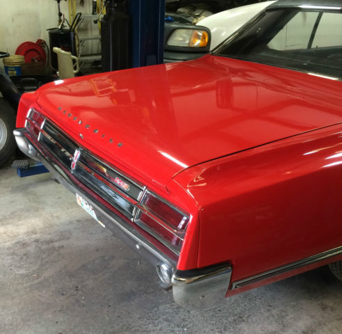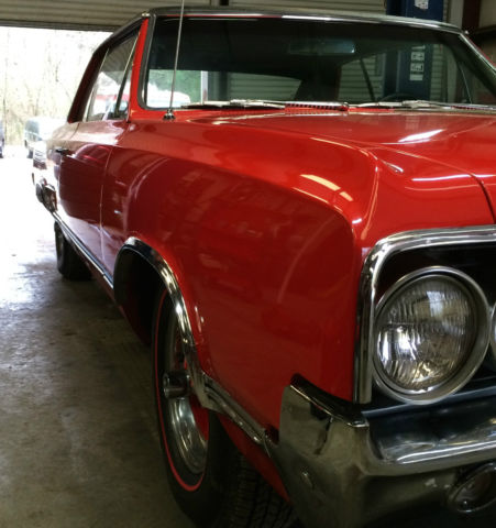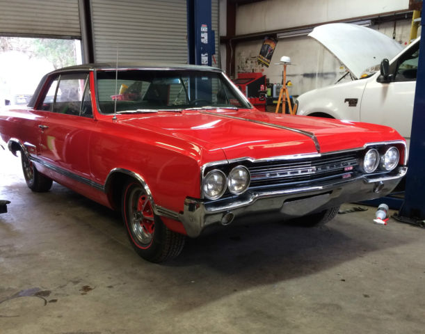 The 400 block was cast on June 15, 1965, the Muncie M-21 4 speed transmission was built on July 21st, and the car was built the 4th week of July, 1965. A professional shop recently overhauled the engine with new rings, bearings, cam, and valve job with guides and seals. The engine did not need boring and the factory steel crankshaft did not need turning. Options on the car are W-29 442 performance package, Muncie M-21 4 speed transmission, bucket seats with console, 3.55 Posi-Traction rear, and radio. This 442 has been partially restored with new paint (a color change from the factory yellow with white top to red with an orange tint leaning toward 1969 Camaro hugger orange), new black vinyl top (not original), new interior, new red line tires, new exhaust including manifolds, mufflers, and pipes, new clutch. pressure plate, throwout bearing, new heater core which I have bypassed with the heater hose at the present time. This 442 is an excellent survivor with no rust, solid clean dry floor pans and trunk, original clean frame and suspension with new shocks at some point, rear end still has the Limited Slip lubrication tag installed. The chrome and stainless is good to excellent with minor pitting. This is a real 442 with the following "442 only" identifying items: Heavy duty frame with one piece rail at the rear (not welded) and an extra lip on the rear frame crossmember. Rear boxed lower control arms, extra welded gussets where the front crossmember meets the frame rails. 3.5 inch diameter driveshaft that necks down at both ends. Data plate shows 4V which indicates the W-29 442 performance option. 400 engine block casting 389298 B, head casting A 383821. The steering wheel is not original, I don't think the Hurst shifter is original, the tach is in the correct position and works great but is a later model Sunpro, the radio is not original. The dash is in great condition with one small crack, the console is in good original condition with slight pitting, the black vinyl upholstery is new, the door panels are new, the carpet is new except the kick panels which are in good original condition, the headliner is new, the paint is new with a couple flaws that I can not capture on a photo. This is a clean, solid, great running and driving 442. It is being sold on a Georgia bill of sale with a current tag slip. The car is being sold on an as-is basis with no warranty of any kind. You are encouraged to personally inspect the car prior to bidding. Please bid only if you have finances in order, have asked all questions, and are ready to purchase the car. I want $1000 cash or wire transfer within 48 hours, and the balance via bank wire transfer within 7 days. Call with any questions 423-413-4669.