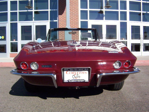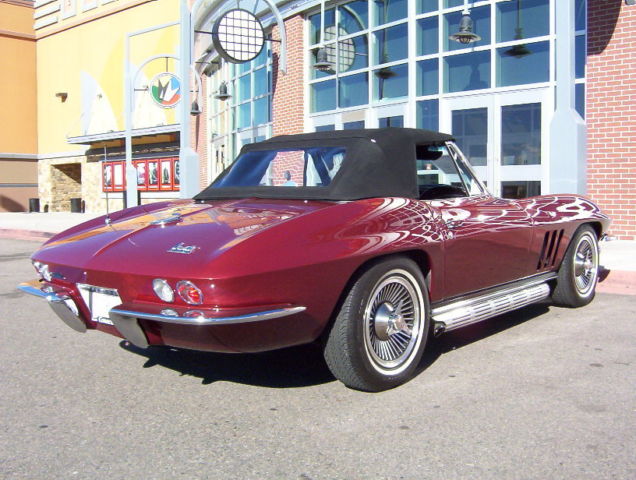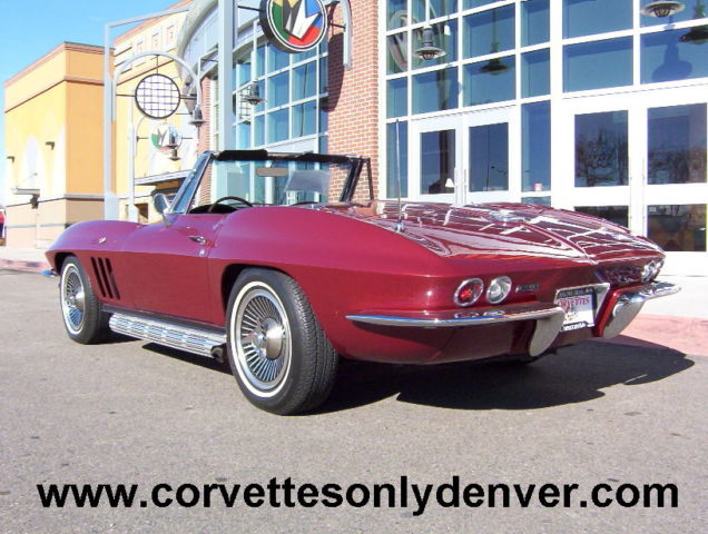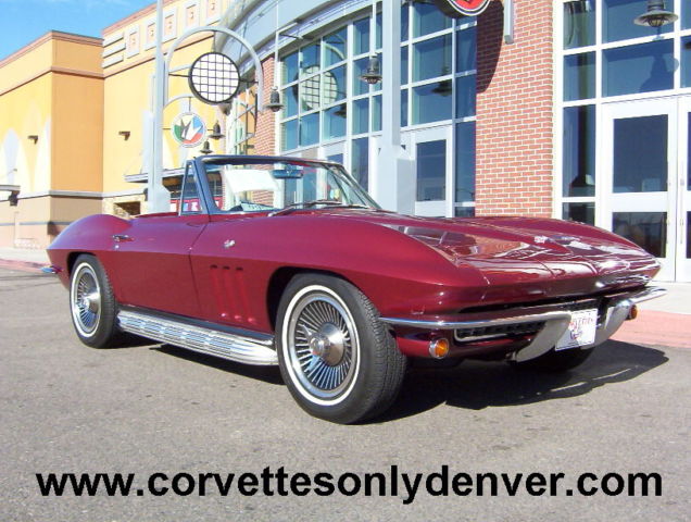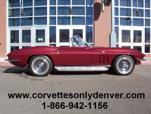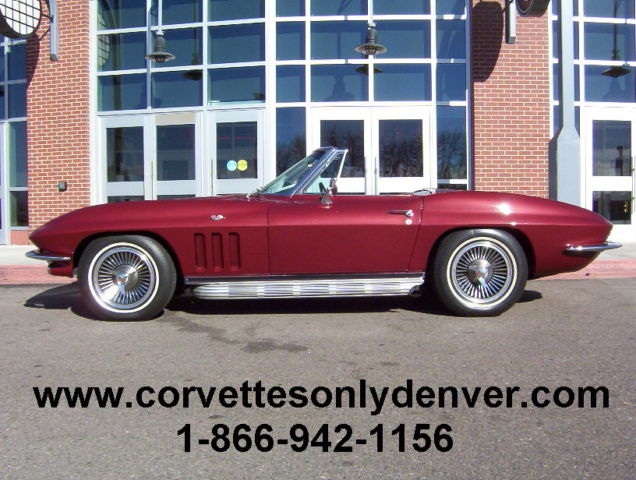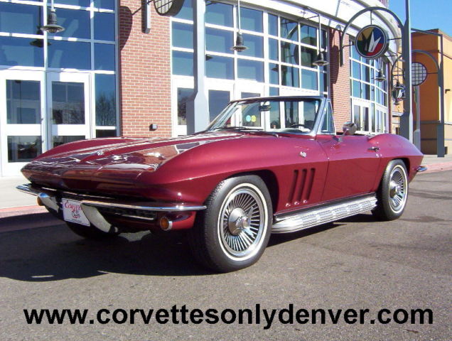 Vin # 194676S1119678 58635 True Mileage Unknown Paint Code # 988A Milano Maroon Interior Code STD Black Vinyl Black Vinyl Soft Top (Newer) 327 ci 300 hp Engine (Performance Rebuilt Numbers Matching Engine) Polished Performance Aluminum Intake Manifold Polished Aluminum Valve Covers Chrome Air Cleaner (K&N Filter) Chrome Alternator Chrome Exhaust Manifolds 4 Speed Muncie Transmission Power Steering Side Mounted Exhaust (added) Soft Ray Tinted Glass (all) Direct Bolt Knock Off Wheels (Reproduction) White Wall Radial Tires 3:36 to 1 Non Positraction Rear Differential Am Fm Radio Lap Type Seat Belts w/ Retractors Adjustable Rear Smart Struts Rods Front and Rear Gas Shocks Spare Tire, Tub and Jack (jack is a replacement) NUMBERS: Block Cast # 3858174 Date Code C296 Stamp Pad # 6119678 F04I3HE Intake Manifold Cast # 3872783 Date Code D56 (Available) Carburetor # 3367 3884505 Holley Distributor # 1111153 Cannot see Date Exhaust Manifold # L/S 3846559 R/S 3747042 Trans Stamp 6S119678 P0411 Differential Code AK Date 4/5/66 3:36 to 1 Standard Radiator # 3155316 76D Replacement Expansion Tank # 3155416 Date Code 66D All the old parts, Intake Manifold, Valve Covers, Air Cleaner, Steel Wheels and Hub Caps all come with the car CONDITION: This car had been Repainted (better than driver, but not show quality), It appears to have all the bonding strips in the correct places and looks like the body/car has never been hit/crashed, the carpet looks to be original and is a little faded in some areas, the Black vinyl seats are in good condition (no tears) and has newer seat backs, the upper dash area is in good condition (no cracks), the rest of the interior is in nice condition, all the gauges work including the clock. The headlights, tail lights, turn signal, brake and back up lights all function properly and the left side headlight motor is weak. The Black convertible top is newer. The grille, chrome bumperâs (front and rear) windshield posts, window frames and all the stainless trim is in good condition. The engine compartment is in decent shape, has top and side ignition shields (no spark plug shields) The frame has some light surface rust but no rot, the front and rear suspensions are in un restored condition, but have been mechanically maintained so the car runs, drives, stops and handles very well. ***VISIT OUR INDOOR/OUTDOOR SHOWROOM WITH 35 CORVETTES, MUSCLE CARS, BOATS & BIKES IN STOCK*** ****CORVETTES WANTED!! **** SELL, TRADE, or CONSIGN YOUR PRE-OWNED CORVETTE!! ****MUSCLE CARS WANTED!! **** Camaro, Chevelle, Nova, El Camino, GTO, Firebird, Roadrunner, Cuda, Charger, Challanger, Mustang ****SELL, TRADE or CONSIGN YOUR PRE-OWNED MUSCLE CAR!!**** ******Why To Buy or Sell to Corvettes Only****** -29 Years in Business. -A wealth of experience in the corvette business. -Full Service Dealership. -We service what we sell. We are a complete Corvette restoration shop. -Large Selection. We have the largest selection of Pre-Owned Corvettes & Muscle cars in Colorado. -Competitive Pricing. Compare our prices with everyone else and see. -Customer Service, As good as it gets. -We make the shopping experience as simple and straight forward as possible, no games. -Close association with local Corvette Clubs. -Keeps us in touch with what people want. -Open Monday-Friday 8-6 Sat. 9-4(Summer Hrs.) Monday-Friday 8-5 Sat. 9-4(Winter Hrs.) CORVETTES ONLY INC. 2300 W. HAMPDEN AVE. ENGLEWOOD, CO.80110 (303) 781-3810 http://corvettesonlydenver.com -Shipping Quote Available Upon Request-