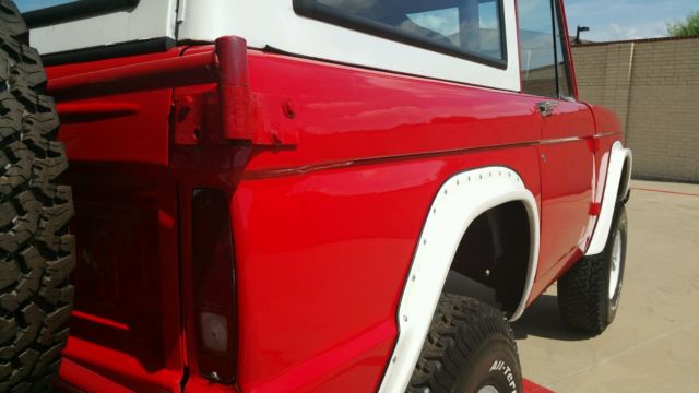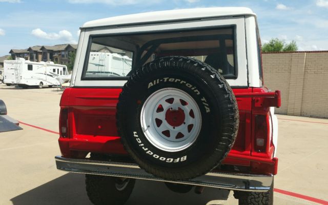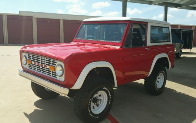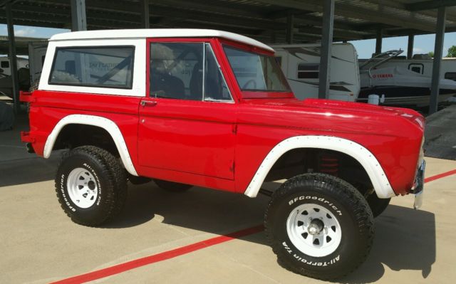 1969 Ford Bronco this is a 1969 Ford bronco with what appears to be the Ranger package. This has been a Texas Bronco all its life- very little rust before the restoration started. It has been about 95% restored 351 Windsor- runs great 3 speed transmission all new Dual Exhaust New clutch New Paint Floor shift new Power steering new Power breaks New BFG tires all around including spare New carpet New seats New Chrome Bumpers front and rear Swing away spare wheel mount New steering wheel Lift kit Detailed undercarriage Steering stabilizer New door speakers Fender flares all new rubber seals around doors/glass and many other new parts Shaved tail gate SOLID FLOORS SOLID WHEEL WELLS SOLID ROCKERS Few things left to finish up: Headlight bezels Turn signals wired Windshield wipers- included Carburetor Tune recover the rear seat (New black seat upholstery included) Small amount of rust in the engine bay (Pictured) The paint is good drivers quality, although new.... the body work was not perfect. Best described as a presentable driver. 4WD works but needs adjusting Compared to others on the market, Id say you are getting a very nice bronco with a clean undercarriage and stout motor for a really great deal. I encourage inspections