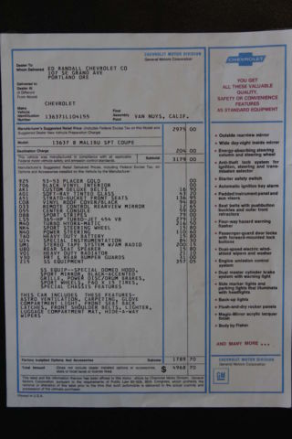 SS Chevelle, with a factory build sheet. Matching numbers engine. Built in the Van Nuys plant in California and then shipped to Portland Oregon where it was sold new. Car has always lived in our rust free North West climate. One high quality repaint on an original paneled body with great body gaps. Check out the spare, it's one of the four factory wheels and tires that come with the car. The other three are not shown but we have them. Seats have been re stuffed and are very supportive. Top notch real SS 454 unmolested and as nice as they get from bumper to bumper. Contact Shep @ 208.721.1973. Click here for additional photos.Click here to view a walk around video.Click here for a test drive video. Show Quality#'s matching engine Original Color scheme Options on the car match up with the ORIGINAL BUILD SHEET Mint interior with restored seats that are supportiveExtremely clean engine bayUndercarriage is as clean as the top side, drives better than it looksNever been quarteredStraight body with excellent panel gapsExcellent chrome and glass. Vinyl top is perfectVIN # 136371L104155 matches build sheet #104155 at the top right. Option List as described on the build sheet. Tinted glassStrato bucket black seatsSS door emblemsLuggage compartment matVinyl TopConsoleHood & Deck stripesPerformance suspension331 rear axl ratiopositrac rear power brakesdiscs up frontV8 454 4 bbl3 speed autoSport steering wheelDual exhaustTilt steering wheelPower steeringrear speakers SS equip package Fee and Tax Information: Out of state buyers will not be charged Idaho sales tax, you will be responsible for taxes in your home state at time of registration. In state purchases will be charged Idaho sales tax of 6% to be remitted by Sun Valley Auto Sales. Documentation fee of $195, In state temporary 72 hour registration $8, Out of state 30 day temporary registration is $5. Winning bidder must contact us within 24 hours of auction end, and make arrangements for payment at that time. A $500.00 deposit is due within 24 hours of end of auction. The remainder is due within 3 days of auction end. If no contact is made within 24 hours we reserve the right to re-list the vehicle, sell it to the next high bidder, or sell it otherwise. If you need financing I can work with your lending institution or I can help you arrange financing. You must have approved financing arranged before the end of the auction. Buyer is responsible for pickup or shipping of this vehicle. We ship 8-10 classics a month through our broker. If you want a quote call or email me. If you wish to have it shipped using your service, we will gladly cooperate. We reserve the right to end the listing if the vehicle is no longer available for sale.