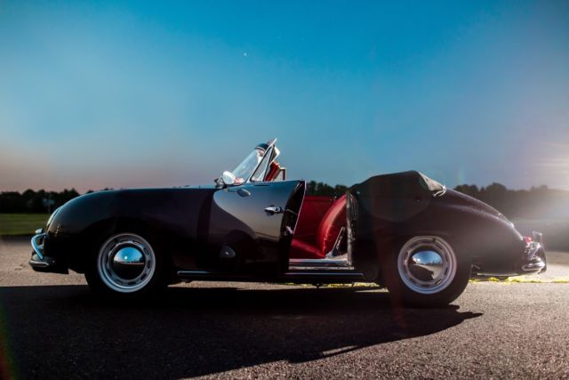 Red interior with black exterior and black soft top Original matching number silver hard top included with car (unrestored rough original condition) No excuses, no expense spared bare metal five year restoration by noted Porsche 356 restoration expert Bruce Baker New red leather interior with German square weave Oatmeal carpet with red piping by noted Porsche 356 ...
