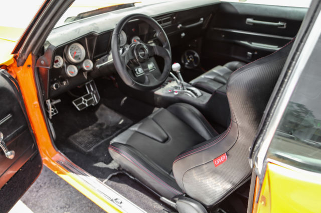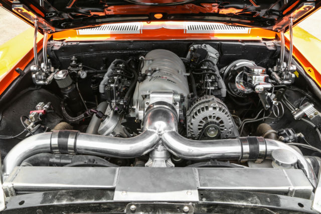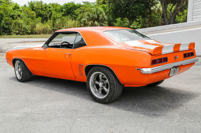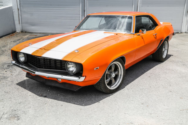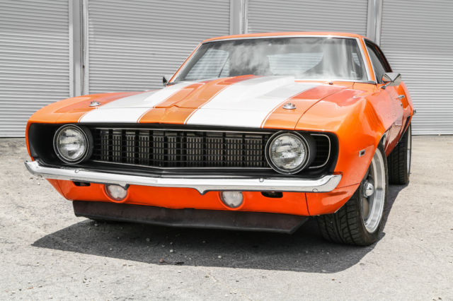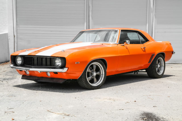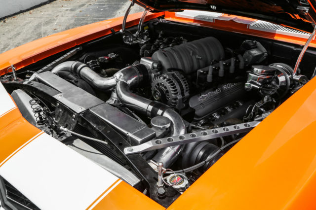 This auction is for a custom 1969 Pro-Touring Camaro. No expense was spared in this over $120,000.00 build. She is a one of a kind, high end extreme driving machine. Newly painted in gorgeous PPG bright orange with stunning pearl white rally stripes. This Hotrod will stand out on the street, Barrett Jackson or any other car show. The heart of this beast is a STREETABLE dyno documented 850 rear wheel HP (Fully forged Chevy small block LS2 Twin Turbo ). Take her out for a quick trip to the grocery store or embarrass any Exotic car owner. This is a true eye grabber and attention getting restomod . ⢠Brand new fully forged LS2 408 Stoker. Dyno tested at 850 RWHP ⢠Twin Precision Ball Bearing 66mm Turbos ⢠Twin Precision 46mm Wastegates. ⢠AMS1000 Boost Controller System - Boost Depended on Speed, Gear & RPM. ⢠Fast 102mm Intake Manifold & Fuel Rails. ⢠Custom Ceramic Coated Stainless Turbo Manifolds . ⢠Custom Fabbed Twin Entry Aluminum Intercooler. ⢠Custom Aluminum Fabbed Radiator with twin electric fans. ⢠Fully Built 4L80E Overdrive Transmission includes trans brake ⢠Custom made 3.5" exhaust system. ⢠Fab 9 Rear End with a 3.73 Gear Ratio. ⢠Cal-Tech Suspension. ⢠Painless wiring harness. ⢠Full Autometer Gauge Setup. ⢠Front & Rear 4 Piston drilled and slotted Brakes. ⢠Dual 4" K&N Intake System. ⢠Custom Carbon Fiber Upholstered Recaro Style Seats with matching rear seat. ⢠Custom Carbon Fiber Upholstered Center Console. ⢠MoMo Carbon Fiber Quick Release Steering Wheel. ⢠Eddy's Motorsports Billet Hood Hinges. ⢠Eddy's Motorsports Billet Hood Lock & Pins. ⢠Ring Brothers Billet Door Striker. ⢠Rev Wheels 17x8 & 17x9 Wheels. ⢠Right Stuff Detailing Chrome Master Cylinder / Booster. There are just too many brand new items and accessories that have been added to list them all. This beauty must been seen and driven for a true appreciation. This special automobile is currently available for sale and is also being advertised in other formats. We reserve the right to end this auction at any time, and as a result, this automobile may not be available for the duration of the eBay listing. All images of the vehicle presented for sale are of the actual automobile being sold and are guaranteed to be free from alteration of any kind. Buyers are always encouraged to call us directly to answer questions or to assist with purchase arrangements at: 954.613.8810 Vehicle is being sold as-is & where is. All questions must be asked prior to end of auction. We strongly recommend that you personally view, inspect, and test drive the vehicle PRIOR to end of auction. Once auction closes, all sales are as-is and final.
