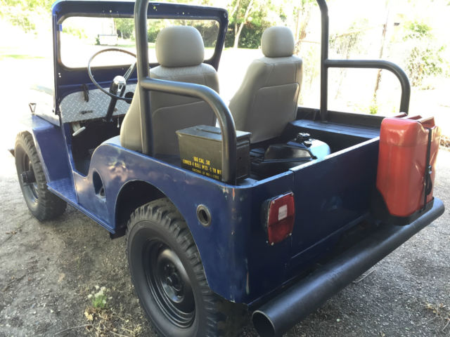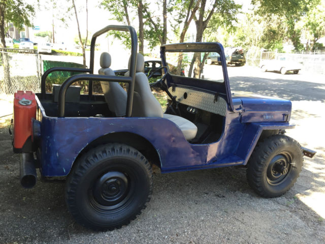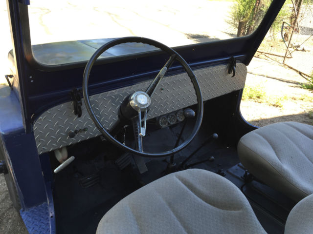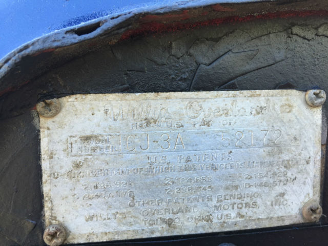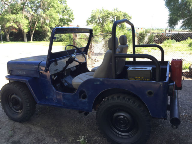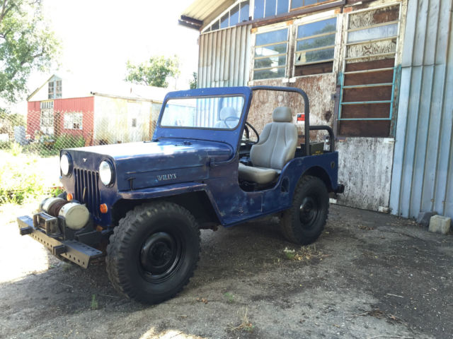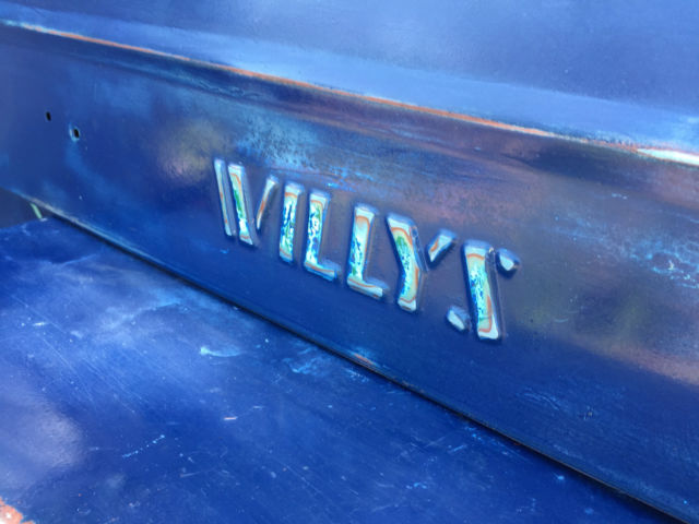 Interesting factoids about this Willy: -high back seats from modern car / truck - original gas tank was removed and replaced with remote tank (poly) in tailgate area - bracing for new seat prohibits proper fitment for original tank. -AMC 196.5 Engine - straight 6 cylinder engine that runs good - SEE CARB - Milage unknown -Ramsey winch (DCB200) on heavy duty front bumper - untested -diamond plated dash (original in underneath) -only gauges to speak of are oil pressure, temp, and amps. NO speedo, no fuels gauge. -no chips or cracks in windshield -no wipers or blinkers -carb (Holley single barrel) was resealed and runs but could use additional tuning. -12 volt conversion done -Oil changed, radiator flushed and refilled -brakes fluids bleed but could use additional work / service -50 caliber ammo can and gas can added for flavor -good stout roll bar - NO tops, bikini or doors included -been repainted several times and probably will get at least one more coat of paint in its lifetime. That said it does have a cool blue patina to it. -rust? yes some here and there..signs of repair at fenders -all tires hold air but they are on the older side for sure. -parking lights work but headlights and brake lights do NOT. For sale locally so I reserve the right to end auction at any time. Transportation / delivery is left to the buyer to handle. I will assist a transport company get it loaded but I cannot deliver it anywhere. Local pick up is welcome as well in Denver, Co. Know that this is a 50+ year old vehicle that has had a very basic "once over". If you are looking for a highway commuter, this is not your car. If you want a fun weekender, trail master (some day) and can turn a wrench this is a great candidate.... Comes as seen with no additional parts...