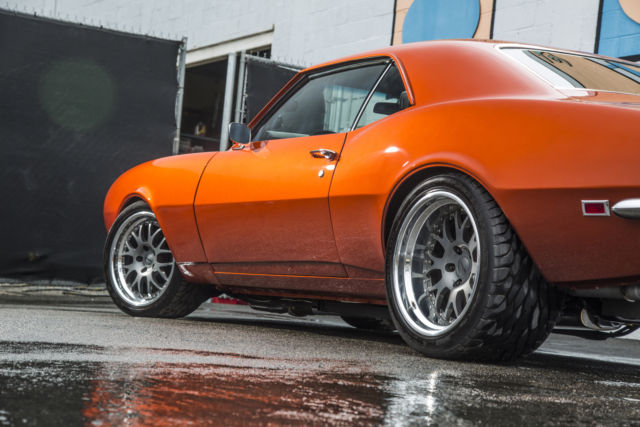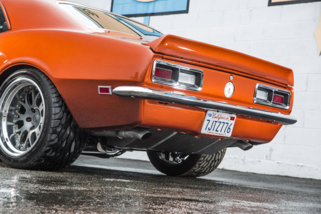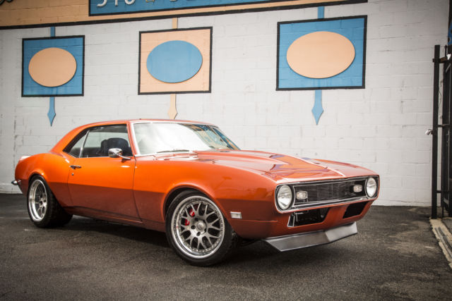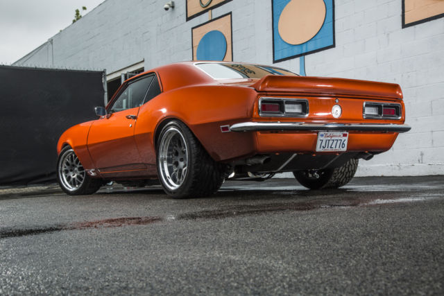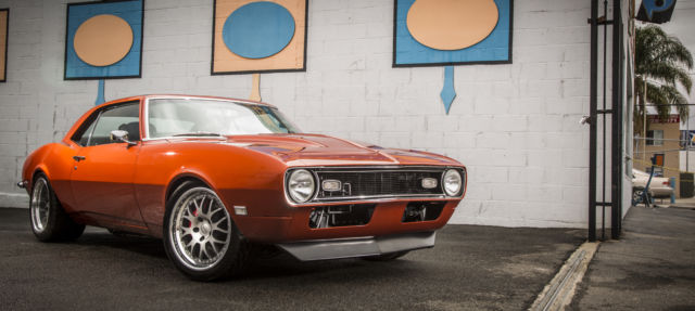 For Sale is my beloved project that I would like another enthusiast to enjoy, show, race, etc. 1968 Pro-Touring CamaroNo expenses spared, 100% restored, Pro-Touring Build. Built to Autocross, Race, and Show. Restoration Complete July 2015All work done professionally at Starlite Rod and Kustom in CA. The car was built for the owner and only top parts/components used. 400 Miles since the restoration completeEngine:525HP â 383 cu. inch Stroker built by AES Engine Specialties - Brodix Heads, Roller Camshaft and Lifters.Holley Dominator Fuel InjectionMSD IgnitionVintage Air Front Runner Serpentine Belt DriveTransmission and Drivetrain Tremec T-56, 6 SpeedHurst Short ShifterHydraulic Clutch PedalCenterforce Performance ClutchMoser 9â Trutrac Rear End with 3.80 gearsMagnaflo Exhaust:Dynatech Ceramic Coated Long Tube HeadersMagnaflo Stainless Steel Exhaust System.Wheels and Tires:Forgeline WC3 3-Piece Wheels with Titanium Bolts18â x 9â Front18â x 12â RearBF Goodwrench g-Force T/AWilwood Brakes:Wilwood AERO6 14â Vented and Slotted Disc Brakes6 Piston Front4 Piston RearRed CalipersWilwood Master CylinderRide Tech 4 Link Suspension:Front - StrongArm Tubular Control Arms and Ride Tech Adjustable Coil Over SuspensionRear â Ride Tech 4 Link with Adjustable Coil Over SuspensionRide Tech Tru Turn System.Paint and Body:Plymouth Prowler OrangeShow Quality PaintZero RustMajority of car is original metalPanel Gaps Are PerfectEngine Bay PaintedAll New Chrome and TrimMini Tubbed Interior:Custom Leather InteriorNew CarpetNew HeadlinerTrimOriginal DashIDIDIT Tilt Steering ColumnSparco Steering Wheel with HornModo Innovation Racing PedalsAutometer Sport Comp II LED Backlit Digital Stepper GaugesAnvil Auto Custom Pillar Gauge MountVintage Air - Air Conditioning with OEM A/C ControlCustom Installed Center GaugesCustom Mounted Alpine Stereo with iPhone/iPod connectionJBL 6 ½â Front Speakers and 6â x 9â Rear SpeakersKicker 8â Amplified SubwooferCustom Leather Seats Inspired by Factory Deluxe InteriorPower M3 Seats with Integrated Shoulder BeltLeather Rear Seats with 3 Pairs of U.S. Made Morris Seat BeltsMiscellaneous:Ricks Stainless Steel Fuel Injection Gas Tank with Integrated Fuel PumpStainless Steel Hard Fuel LinesHID Head Lights with High BeamsLED Tail LightsTrunk is carpeted and finishedOptimal Battery Located in TrunkLojack w/ Early Detection Installed. SERIOUS INQUIRES ONLY.Will Ship Car Pending Funds Clear. Car is also listed locally.