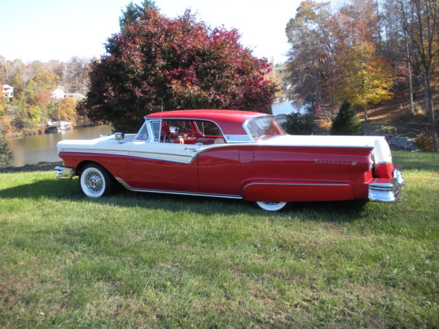 This is a frame off restoration of a rust free car showing 95,780 miles. It was refinished in the original Flame Red over Colonial White colors. This Skyliner has the following Ford options: A 312 cid 245 HP 4 barrel carb Thunderbird Special V8, Automatic Transmission, Selectaire Air Conditioner (converted to R34), Master Guide ...