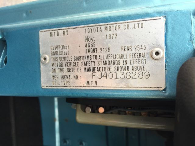| VIN (Vehicle Identification Number): | FJ40138289 | Year: | 1972 |