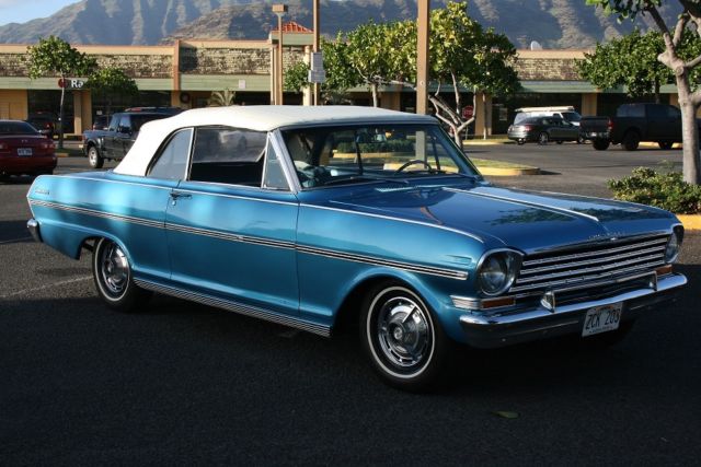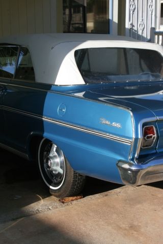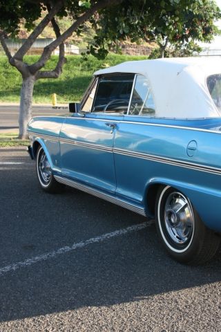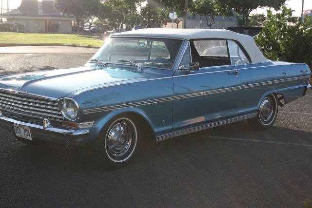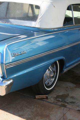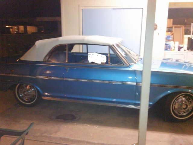 HERES YOUR CHANCE TO OWN A VERY CLEAN 63 CONVERTIBLE CHEVY NOVA SUPER SPORT. 45605K MILES ON A STRAIGHT 6 ENGINE. INTERIOR IS PERFECT NOTHING IS RIPPED OR OLD. AND CHROME IS NICE. 8 TRACK RADIO STILL WORKS AND I HAVE A ELVIS AND KENNY ROGERS CASETTE. I PUT NEW SPARK PLUG WIRES, PLUGS, CAP AND ROTOR AND MASTER CYLINDER. NOW THERE IS A SMALL HOLE IN THE RAG TOP...AND IT COST 249.00 FROM CLASSIC INDUSTRIES. THE TOP ISNT BAD...IT JUST HAS A SMALL HOLE THAT MAYBE CAN BE REPAIRED. THIS HAS ALWAYS BEEN GARAGED BEFORE ME GETTING IT, AND I ALWAYS HAVE IT COVERED. THERE IS NOOOOOO RUST ON THIS. ALL DOORS AND TRUNK ARE NICE. THERE ARE SOME SMALL NIC'S ON THE CHROME AND A SMALL CHIP ON THE PAINT THAT CAN BE FIXED.. AND IT DRIVES FINE..NO PROBLEMS On Nov-18-14 at 17:06:05 PST, seller added the following information: THIS NOVA RUNS PERFECT AND DRIVES WELL...GETS UP ON THE FREEWAY On Nov-18-14 at 20:49:53 PST, seller added the following information: I have two extra nice looking hubcaps, and center console On Nov-19-14 at 06:04:32 PST, seller added the following information: 4 lug On Nov-20-14 at 08:53:31 PST, seller added the following information: oh and prior to me getting this car it was always garaged and in storage. I always keep a cover on it as well On Nov-20-14 at 13:32:18 PST, seller added the following information: here are some video's https://www.facebook.com/video.php?v=10205056920283640&l=8240639387801710100 https://www.facebook.com/video.php?v=10205057972349941&l=4143695149320718637
