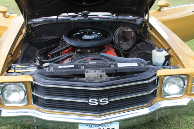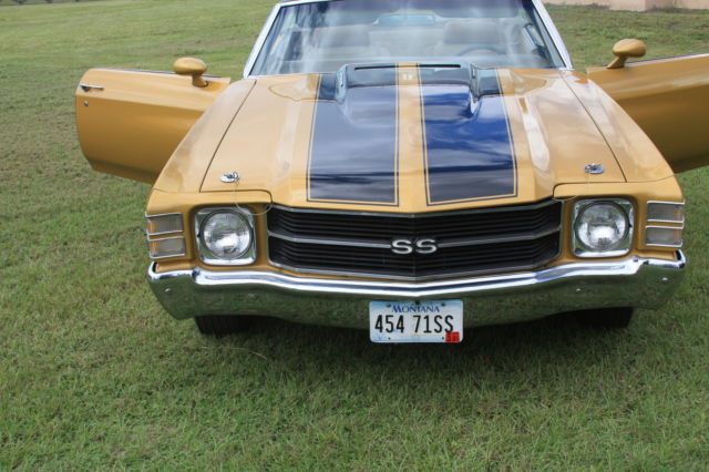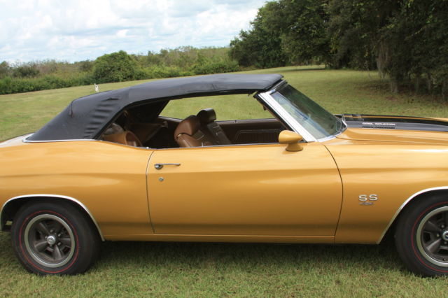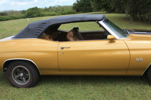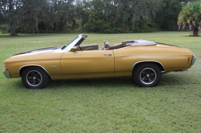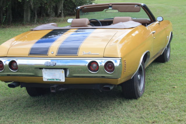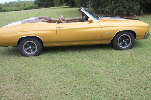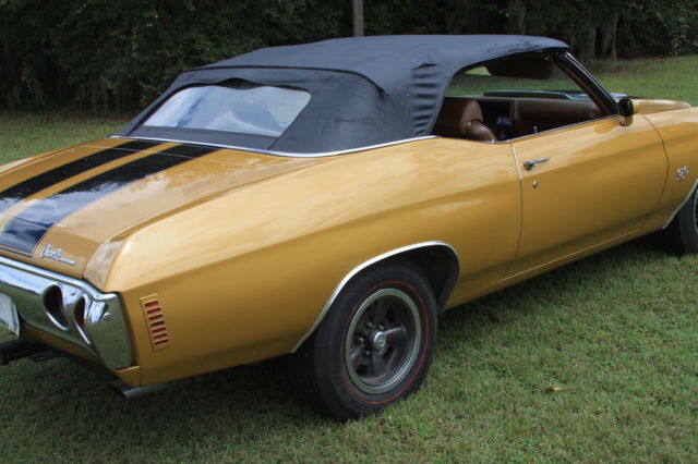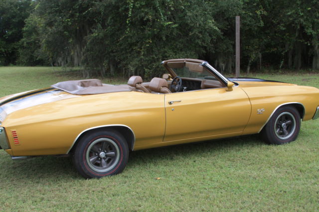 1971 Chevrolet Chevelle Convertible. All Original Matching Number car. Original 454 CI LS-5 365 Horsepower. This is a Driver car. It has been Re Painted in 2005 using the Original Factory G/M Gold paint. The Interior is All original, Showing wear but this car has been Garage kept since New. AND covered with a Car cover. Original "AUTOMATIC' Black convertible top works perfectly, And is in Good Condition. 112,000 Original Miles on this car. ALL Original Factory Papers & Books are included with this Sale. Engine is strong and runs great. This is a MATCHING NUMBER CAR. Any parts that have been replaced have come form the 'Original Parts Group' or G/M Parts Direct. Hoses, Clamps, Screws, Bolts, Belts, Even the battery is G/M. Exterior has all original parts, This car was never wrecked or had body work. Body has Original bumpers, Trim, Rims, Grill, Hood, Roof & Symbols. NOTE: The sticker on the Air Filter is NOT Correct. This is a 365 Horsepower LS-5, Not 425 Horses. NO Rust, Everything works correctly. The Radio has been replaced with a modern but 'old looking' Radio that will really work. I have put a Reese Trailer hitch on this car that can be removed if the New owner prefers. This car has not been driven (only started) in the last 5 years. Turn the key and drive this Powerful Monster. Call Brian; (305) 989-1565