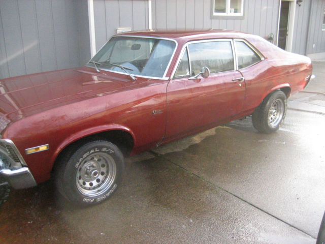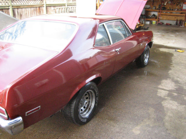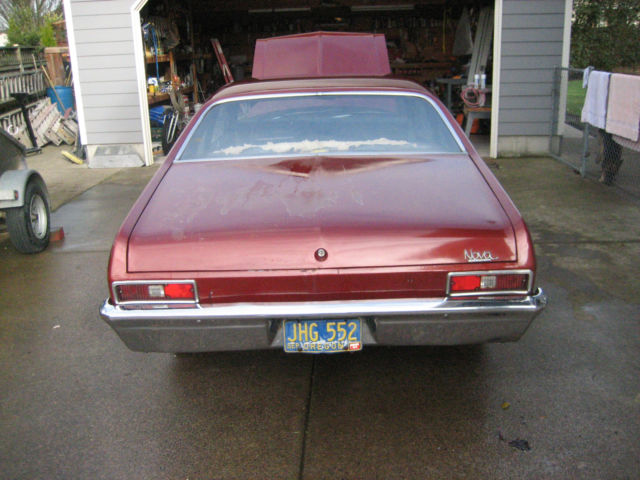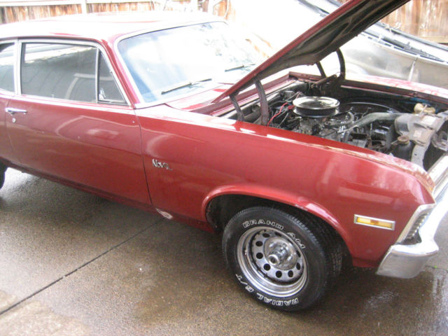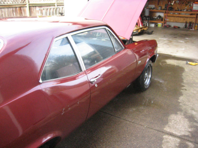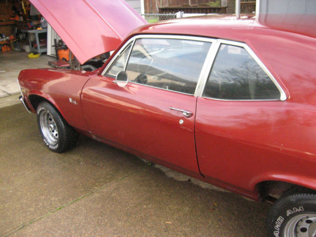 1971 nova as far as metal this car needs front patch panels, Rear patch panels only, not quartes,needsTrunk pan, floors are good in back seat, fronts have small pin holes, I dont think they need new ones, I por15 them. The tires are 14 inch nice condition, Rims are rusty. Brakes turn signals windshield wipers all work. All glass is good except front windshield small crack at botom center. they all roll up and down nice. Needs intior package every thing is there took seat out to paint floor head liner has one small tear fixable. Car has air shocks and corvette 4 speed auto, And was told reman 350 engine runs good Edelbrock manifold and carb, dull exaust. This car has been in a garage and not driven for 8 years the person that owned it left wet stuff in trunk thats what rusted the trunk out. Needs gas tank i think or maybe just sending unit. This car would make a nice builder. Car runs drives stops good but has temp gas tank hooked up. Car can drive on a transport vehicle but not road worthy yet