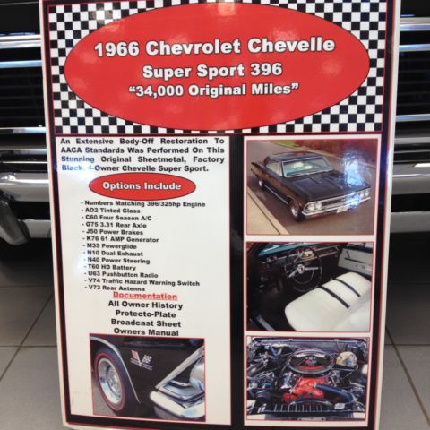 Sold new at L.B. Knight Motor Company in Greenville, KY. on 11-26-65 to Mrs. Pearl Long of Rochester, KY.......Factory Documentation includes: Original Factory Build Sheet - found inside the car, Original Factory Protect-O-Plate, Original Factory Warranty Manual, Original Owners Manual, Original Owners Manual Plastic Sleeve, Original Chevrolet Custom Feature Accessory Book from 1966, Original L.B. Knight Motor Co. Lubrication Dealer Reminder, Original L.B. Knight Motor Co. Paper Glove Box Holder, Original Key Numbers with Keys, Copies of Titles with the Owners and Documented Mileage, Receipts, Old Factory Part Option Stickers that came off the springs, shocks, etc. when built, Snap On Calendar featuring this SS, Documented Display Sign, etc. This is an exceptional opportunity to invest in a low mileage SS Chevelle with full paperwork documenting it's provenance. Paperwork is everything! Tuxedo Black (AA) with an original Ivory interior (798) that is near mint, 396 V8 325 HP, PS, PB, Factory Four Season Air Conditioning, Front and Rear Bumper Guards, 12 Bolt Factory Rear End with 3:31 Ratio, Tinted Glass 61 Amp Generator, Dual Exhaust, H.D. Battery, Factory Clock in dash, Factory Delco Push Button AM Radio, Traffic hazard Warning Switch, Rear Mounted Antenna, etc. All the original spot welds are in place for the quarter panels, rockers, etc......all original sheet metal! The correct T3 headlights are present and the turn signals, headlights, wipers and radio are all in working order. Correct tar top battery, Spiral Shocks, Four Brand New Firestone Red Line Tires...... plus a brand new set of Hurst Accessory Wheels have been installed. Inspection markings and part number stickers have all been re-installed! NADA Classic Car Value Guide estimates a #1 SS396 at $60,000 with out any addition for the low mileage or Hurst Accessory Wheels. Any questions, please call 612 889 2212. Thank You.