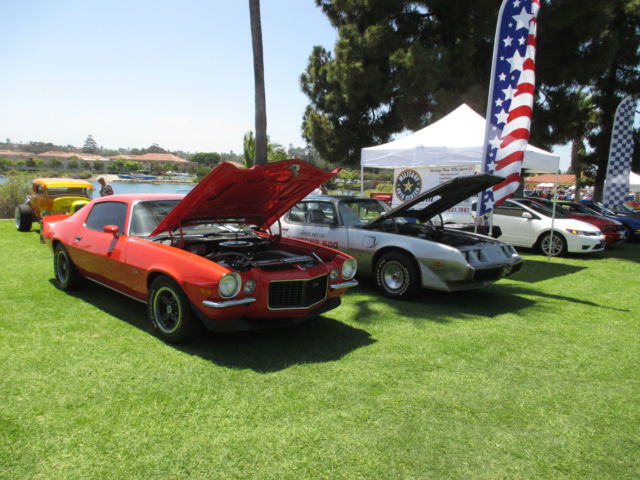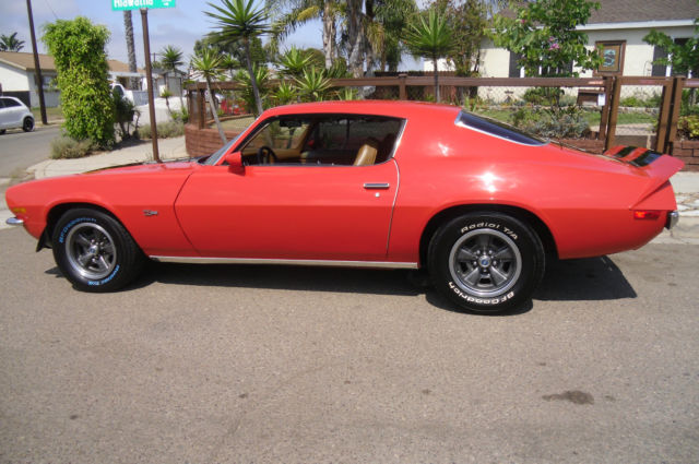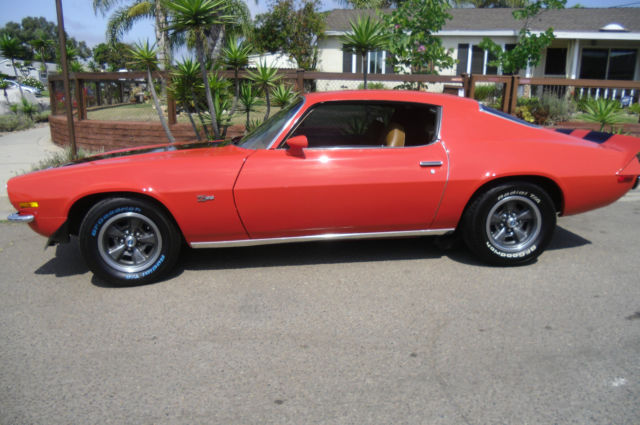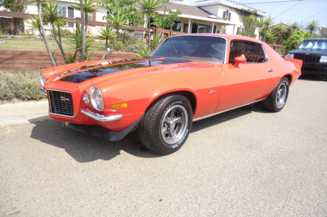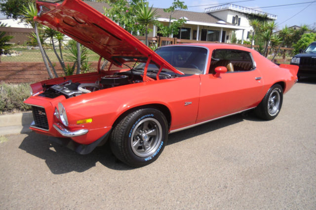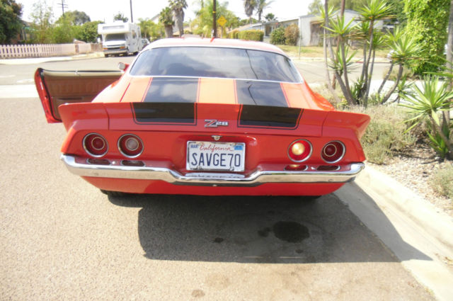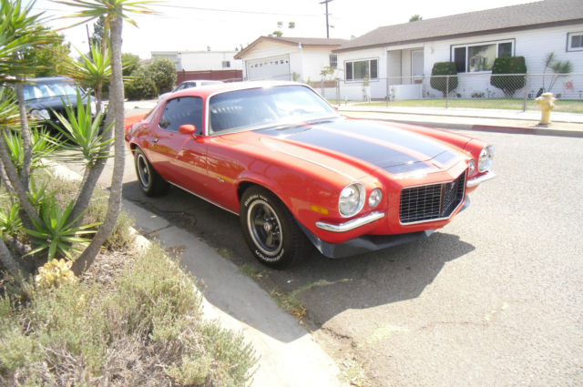 THIS IS A GORGEOUS AND RARE REAL 1973 CAMARO RS Z28 AND U CAN TELL THAT BY THE LETTER T AS 5TH DIGIT IN THE VIN,I HAVE OWNED THIS CAR FOR 5 YEARS AND BOUGHT IT FROM A WELL KNOW RACE DESIGN COMPANY IN COLORADO.THYE CAR HAS BEEN SITTING IN MY GARAGE COVERED AND STARTED UP AND DRIVEN AROUND THE BLOCK A COUPLE TIMES A MONTH.ITS A WASTE FOR SUCH A BEAUTIFUL CLASSIC TO SIT HIDDEN,BUT I LOVE THE CAR ,JUST DONT HAVE THE ROOM FOR IT ANY LONGER AS MY COLLECTION HAS GROWN OUTTA CONTROL,SO IM SELLING OFF SOME OF MY PRIZED POSSESSIONS,THE CAR HAS A SUPER STRONG LT350 THAT RUNS AND SOUNDS AMAZING,THE BODY IS RUST FREE AND STRAIGHT(ALL ORIGINAL BODY PANELS AND NO KNOWN BONDO )AND ORIGINAL RUST FREE FLOOR BOARDS AND TRUNK, AND THE PAINT IS BEAUTIFUL,ITS A VERY RARE COLOR COMBINATION OF THE ORANGE/RED W BLACK STRIPES AND BEAUTIFUL DARK SADDLE INTERIOR,WHICH IS A GREAT SWITCH FROM THE STANDARD BLACK (THAT EVERYONE ELSE HAS),THE CAR HAS POWER STEERING,POWER DISC BRAKES,FACTORY MUNCIE 21 4 SPEED AND A HURST COMPETITION PLUS SHIFTER THAT SHIFTS BEAUTIFULLY,IT HAS THE UPGRATED 6500 RPM TACH AND GAUGE PACKAGE AS WELL AS AFTER MARKET,OIL PRESS,TEMP AND VOLT METERS,THIS CAR GETS THUMBS UP EVERYWHERE I GO,IT HAS SUBFRAME CONNECTORS AND TRACTION BARS,HEADERS FACTORY Z28 WHEELS AND BRAND NEW BFG RADIALS ALL AROUND,IT EVEN HAS AN OLD SCHOOL CRAIG REMOVEABLE CASSETTE PLAYER THAT SOUNDS GREAT(REALLY SHOWS ITS VINTAGENESS,ALL NEW RUBBER WEATHERSTRIPPING,CHROMED OUT AND BILLET MOTOR,MSD IGNITION,NO LEAKS OR ISSUES EVERYTHING WORKS AS IT SHOULD,ONLY 53K ACTUAL MILES THIS CAR IS REALLY AMAZING HATE TO SELL IT ,NADA BOOKS IT AT @$52000+ AND THEY ONLY KEEP GOING UP IN VALUE,THIS CAR RESIDES IN SUNNY SAN DIEGO,FLY IN AND DRIVE IT ANYWHERE OR BETTER YET I CAN HELP U ARRANGE SHIPPING TO YOUR DOOR,HATE TO SELL BUT NEED THE ROOM,U ARE WELCOME TO VISIT AND SEE AND DRIVE THE CAR,IN FACT I ENCOURAGE IT,THE CAR IS BEING SOLD LOCALLY AND I RESERVE THE RIGHT TO END AUCTION EARLY IF SOLD THX 858-344-0530 AND YES THAT IS ALSO MY 1979 TRANS AM 10TH ANNIV DAYTONA PACE CAR WS6,Y89,L78 4 SPEED TRANS AM ONE OF ONLY 1817 EVER MADE ITS 100% MATCH #S AND ONLY 68K ACTUAL MILES IT TOO IS FOR SALE