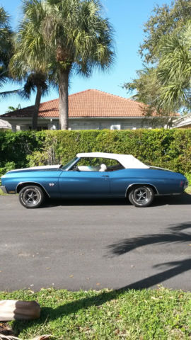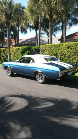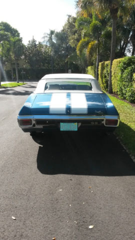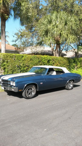Restoration was just completed in 2011 on this undocumented 1970 Chevelle convertible Super Sport. It has just had a complete photo documented frame-off concours restoration to LS6 specs. Special care in detailing was taken to keep this legendary car looking as factory correct as possible. Painted in correct original Fathom Blue with white stripes and pearl white interior really make this car stand out. Powered by a restamped 1970 LS6 engine it also has the M22 4-speed Rock Crusher option and 12-bolt posi-traction. All engine and drivetrain parts are completely date coded correct for this car. Super fine and correct detailing in the engine compartment make this car really stand out. Fully optioned with the functioning Cowl Induction hood. This car was rust free before restoration, all original floors and quarters. The MSD box you see in the pictures is mounted with Velcro, and was added for easier starting and better performance with 11to1 compression and 93 octane, the date code correct distributer is included in the sale, the car has 251 miles since being restored and is in pristine condition and fun to drive, a CD of several hundred pictures of the restoration is also included Do some research on Barrett Jacksons Palm Beach 2014 sale. look at lot #419 it sold for $100,000.00, disclosing the re stamped engine, and the buyer paid 10% commission and Florida sales tax on top of that! this is a very similar restoration. the seller walked away with $88,500. after paying his 10% commission, and entry fee, also lot #391 Palm Beach 2014 sold for $100,000. plus 10% commission, and was an automatic transmission car. Barrett Jackson Las Vegas October 2014 marks a new high of $115,000 . that $126,000 with the commission Please call with any questions or for more pictures. Mark 917 331 5966