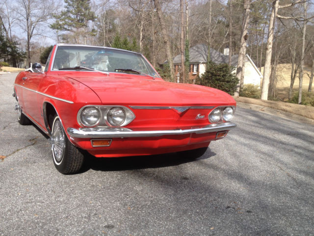 For Sale is a 1966 Chevrolet Corvair Monza. It has a clear title with 66069 miles. I am selling the car for a friend but did some recent mechanical work on it so am prepared to answer most questions. I will be as bluntly honest as I can so that you have all the info you need to make a decision. The engine is a typical Corvair 6 cylinder and the dual Rochester carbs have been recently rebuilt. At the same time, new plugs were installed...gas lines were cleaned and a new gas tank was installed. The engine starts and runs well, but does drip some oil and sometimes after sitting a while will burn some oil on startup. I believe the car to be underpowered, but that is my opinion of all non modified Corvairs. The Red paint looks very nice but has been repainted. The paint job is good but not excellent. The body is straight and mostly clean but there are some small areas near the rocker panels that look like bubbling paint (rust). No obvious holes but the beginning signs are there. These areas are small and could be easily addressed. The rest of the body is clean with a couple small scratches or dents at the corners. The White interior is in OK shape. The front buckets are both pretty clean with no tears or significant wear. The back seat however has several patched up tears and appears to have been painted over with white vinyl paint. Sun visors are ok but could stand to be replaced. Black carpet is clean and in above average shape...probably replaced at some point. Convertible top is white and in good shape. Rear window is somewhat foggy. Electric top works as it should. Original radio is gone but pretty much everything else on the car looks original. All in all, the car is a nice example of a running/driving Corvair and is priced accordingly. Thanks for looking, feel free to ask any other questions.