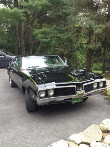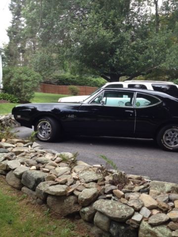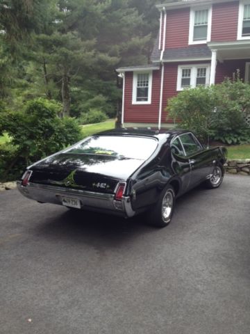 1969 oldsmobile cutlass 442 clone with 87,385 miles. The car is black with custom green pinstriping, no dings, no dents or rust on the exterior, body is straight. Single stage paint nice and shiny in great condition with minor imperfections or thinning in some spots. All chrome is immaculate, the front and rear bumpers are brand new old stock and are mint, brand new grilles also. 455 big block engine, headers, true duel exhaust, electronic ignition, 4 barrel holley carb, posi rear, turbo 400 trans. A extremely fast vehicle, has new bf goodrich tires, new gas tank, rust free undercarraige, no leaks, nothing mechanical needed. Some repairs included fuel pump, rebuilt the original power steering box and new hoses, rebuilt the rear end axels etc. Interior is in immaculate condition green vinyl seats look brand new, black carpets, green dash uncracked, door panels and headliner immaculate. This is a air conditioned car, I have all the parts to install back as it is not hooked up. All blinkers and lights work as they should, trunk is immaculate shape with original spare. 1969 is a very desireable year in these cars as the tail lights were only one year. A turn key car that needs nothing, a car that is very sought after and highly collectible.I will be happy to answer all questions or feel free to view in person as the pics do not do a justice to the true beauty of this car. Thanks and good luck!