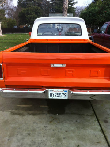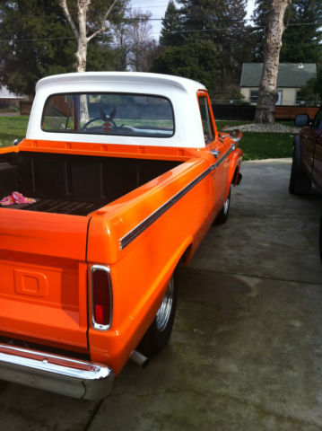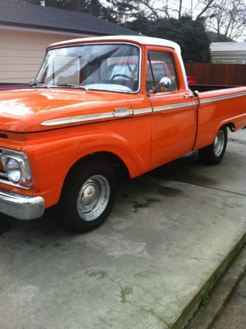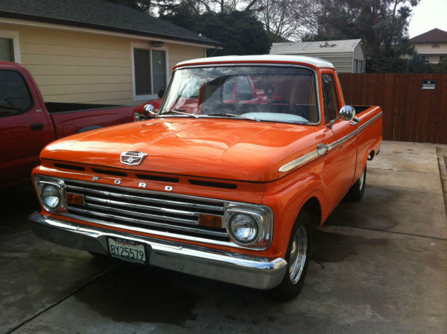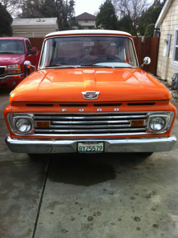 1964 FORD F100 FLEET SIDE SHORTBED PICK UP. *6 CYLINDER, RUNS GREAT *3 ON THE TREE *BODY AND PAINT IN EXCELLENT CONDITION *NO RUST *ALL MOLDINGS IN GOOD CONDITION *FRONT AND REAR BUMPER NICE CHROME WITH NO DENTS OR DINGS *NEW TIRES AND CHROME RIMS (SMALL SURFACE RUST ON CHROME CAP AND RIM) *GRILL IN PERFECT SHAPE AS WELL AS HEAD LIGHTS AND RUNNING LIGHTS *ALL FACTORY GLASS (WINDSHIELD HAS 2 SMALL ROCK CHIPS, ALITTLE SMALLER THAN A DIME) *SPRAY ON BEDLINNER * FACTORY MIRRORS *INTERIOR IN GOOD SHAPE (SEAT HAS A SMALL HOLE IN PASSENGER SIDE, SIZE OF AN PENCIL EASER) *DASH IN GREAT SHAPE (UNCUT) *RUBBER FLOOR MAT *NEEDS HEAD LINER (HAS INTERIOR LIGHT) *RECENT TUNE-UP *NEW BATTERY (2012) *CLEAN CALIFORNIA TITLE This 1964 Ford F100 was left to me by my dad 3 years ago. He had several hot rods and this one was one of his favorites. We would love for this truck to go to a good home, someone who will take care of it like my dad and I have. I'm new to Ebay and would like great transactions. I want to note we will be posting additional pictures of the engine compartment and interior. My phone camera won't take any more pictures at this time. Please feel free to contact either myself or my wife with any and all questions. Michael 916.410.4673 or Gina 916.847.7126 Thank you and good luck bidding.
