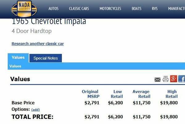 I have a 1965 Chevrolet Impala 4-Door that I'm selling The car starts with under 50k miles it doesn't run because it needs a tune up & has a valve cover gasket leak (so it smokes but u can find the cover for $25-50) The car is in fair condition but overall good condition for it's age with a little rust, nice headliner, nice seats though it needs new trim & does have a small rip on the drivers side & interior drivers side panel needs to be re-done. The original 283 engine has been replaced & the trans both with 350's it also has a new carb. I have the keys & title in hand contact me for location car is now in East Chicago Indiana @ my sister's place no tire kickers no scammers no low ballers price negotiable already selling for less then its worth in fair condition @ fair market value ck my pics of nada classic price guide !!! serious only paypal/cash only !!! do NOT contact me with unsolicited services or offers