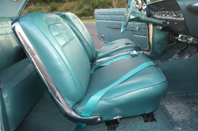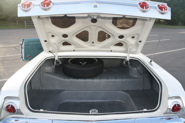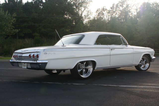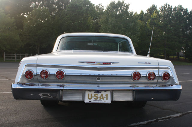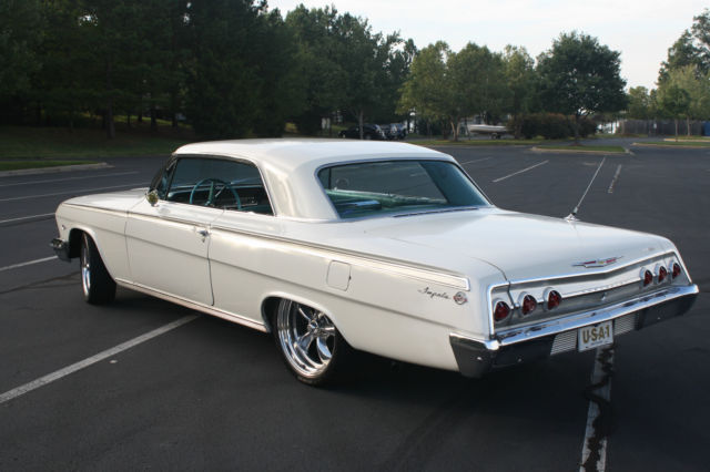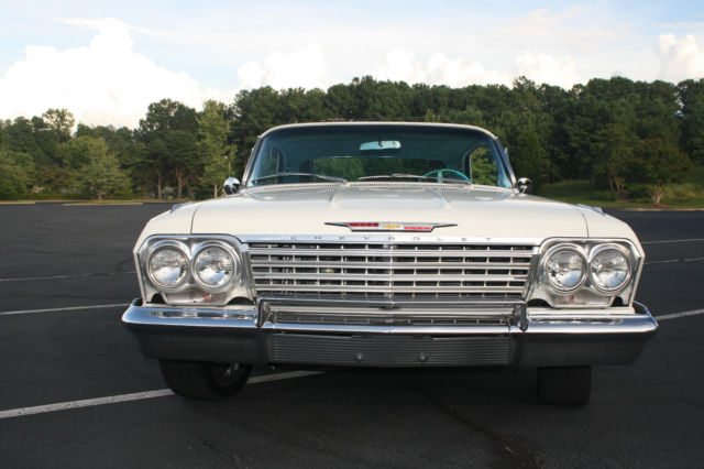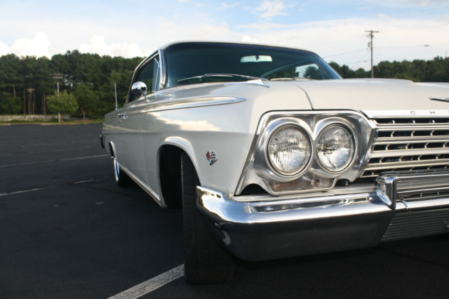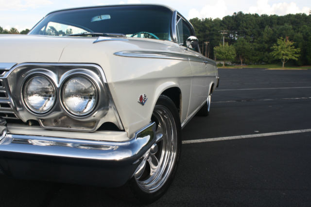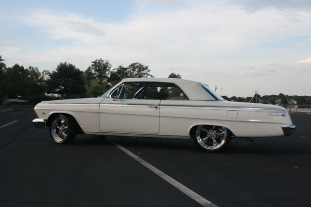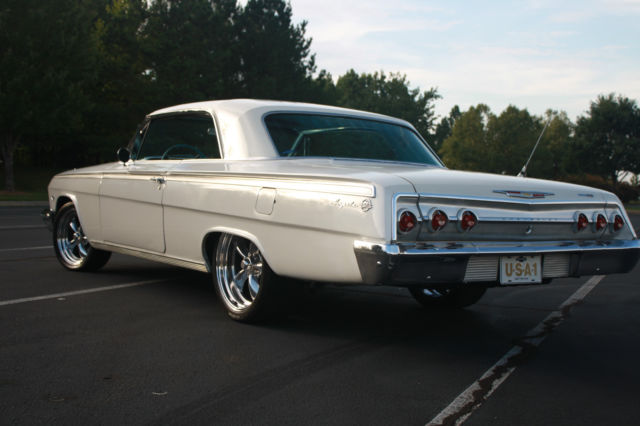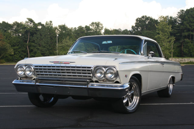 1962 Impala SS Restomod. Has been mechanically rebuilt from front to back. This car is a Los Angeles built, true SS with factory A/C. Ermine white paint is 80% original. All original steel. The aqua interior is new. Seats, seat foam, sound deadening, carpet, door panels, and kick panels have been replaced. The steering wheel has been refurbished. All interior chrome is in very good condition. The AM radio is original and works. Classic Instruments gauges have been installed. The exterior trim and emblems are in very good condition. Bumpers show some pitting in the chrome but shine bright in sunlight. Despite its original paint and patina, this car has undergone a complete mechanical restoration. I have a binder full of receipts that total over $15,000 in parts alone. Buyer will get binder and photo album detailing the rebuild. This car rides and drives like a new car. Here are the details: - Competely rebuilt the original 327 with mild cam, 210 valves, and new carb. Resprayed and cosmetically restored. All new rubber, belts, hoses, etc. - Installed new 700R4 automatic transmission. - Rebuilt rear-end, installed 3.73 gears, repaited with correct matte black and red oxide primer. - Chassis and undercarriage stripped and repainted. Have pics of underbody before respray. - Front inner fenders stripped and resprayed, firewall stripped and resprayed in Ermine White. - Added front disc brakes from Hubbards, new brake lines, rebuilt rear drums, added new upgraded brake booster. - Installed CPP front A-arm suspension, new shocks, all new bushings, and MOOG springs. - Replaced original A/C with Vintage Air Gen IV system. - Installed CG&J custom aluminum radiator. - New fuel tank, fuel pump, and lines installed. - New wiring harness, electrical components(voltage regulator, solenoid, starter, etc.) - 18"/20" American Racing Torque Thrust wheels, polished. - Cosmetically refurbished exhaust manifolds and installed new exhaust system with Magnaflow mufflers. - Rebuilt wiper motor and cosmetically refurbushed articulation and arms. - Cosmetically refurbushed trunk, installed new trunk mats. Original spare tire and jack are still in the trunk. I'm happy to send pics of anything specific you'd like to see. Car is located in Huntersville NC. Call 704-651-5349.