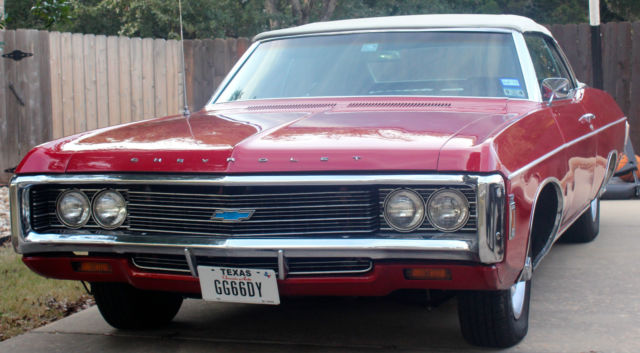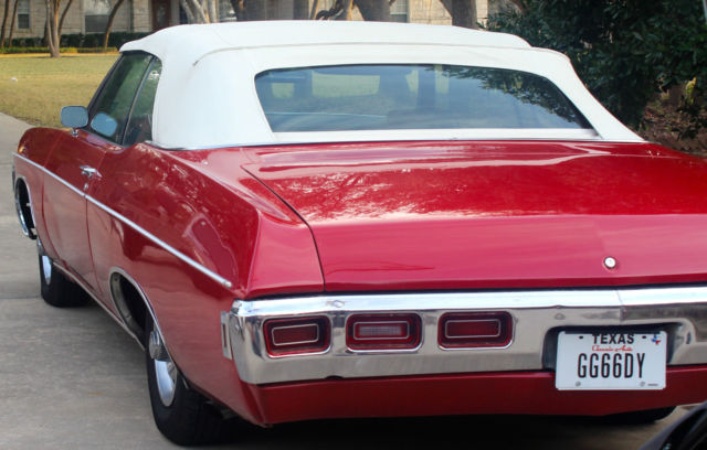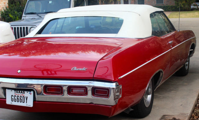1969 Chevy Impala convertible with a 427 big block Edelbrock engine, with only about 30,000 miles on it. The stock motor is a 327 big block but after about 55,000 miles i decided to put in a 427. The odometer has about 87,500 miles on it. Has a brand new y-piped exhaust all the way from the headers. Just replaced power steering fluid, coolant, and got an oil change, and got a brand new battery about a week and a half ago. I also will have the car detailed this weekend including the motor. All black leather seats in excellent condition and the convertible top is automatic up and down. Everything is in perfect condition, all the lights are working perfectly fine; brake lights, reverse lights, taillights, headlights, brights, blinker lights, and all the interior lights. Will come with 2 sets of original factory keys, and factory everything except the radio which needs to be rewired which is a very easy fix. This car has been babied and there have been no problems whatsoever. Feel free to text me whenever for any questions or more pictures of the vehicle at 5127392710. This car lists at $24,672 on KBB Classic Auto and NADA with the 327 motor not the 427 and without the exhaust system. Need to have this sold by the first week of February. Only asking $20,000 OBO, willing to negotiate but don't give me any low ball offers because i know what this car is worth. Thank you