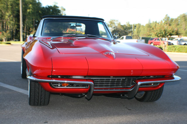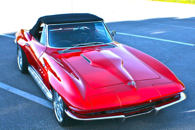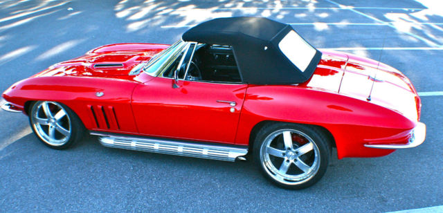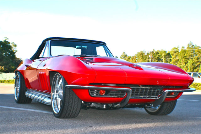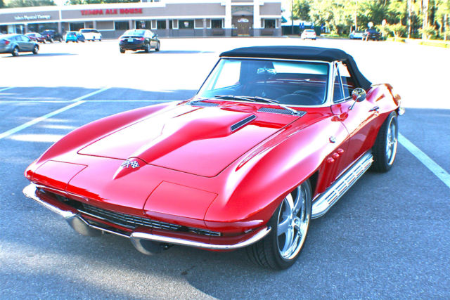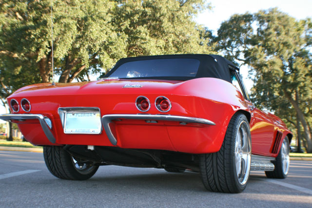 THANKS FOR CHECKING OUT MY FRESHLY BUILT RESTO MOD CORVETTE. IVE LOWERED THE PRICE FROM 125,000.00 FOR A QUICK SALE SO PLEASE MAKE REASONABLE OFFERS. ITS A ONE OF A KIND CAR THAT WILL MAKE ANYONE VERY HAPPY. THERE ARE VIDEOS ON YOUTUBE UNDER THE HEADINGS " 1966VETTELUCILLE2 " AND "1966VETTELUCILLE3 " ITS GOT SOME GREAT VIEWS OF THE CAR. ITS HARD TO DESCRIBE SUCH A MODIFIED VEHICLE IN A FEW SHORT WORDS SO I WILL TRY AND GIVE YOU THE BASICS AND YOU MAY CALL ME TO DISCUSS ANY ITEMS YOUR INTERESTED IN AT 813-505-5307 IM NOT A DEALER, ITS MY CAR AND I BUILT AND DRIVE IT. LS2 ENGINE CUSTOM FRAME MADE FROM THE ORIGINAL AND MODIFIED TO ACCEPT THE NEW DRIVETRAIN AND SUSPENSION TREMEC 5 SPEED TRANS STAND ALONE ENGINE MANAGEMENT WITH CUSTOM PROGRAMMING VINTAGE A/C CUSTOM STEREO SYSTEM HYDRO-BOOST POWER FOUR WHEEL DISCS WITH FULLY MODIFIED CALIPERS AND ROTORS FROM VETTE BRAKES COIL OVER FRONT SUSPENSION RACK AND PINION STEERING 19 INCH VOSSEN WHEELS WITH HANKOOK V12 TIRES 9 INCH FRONTS, 12 INCH REARS LEATHER SEATS CUT PILE CARPET WITH SOUND AND HEAT BARRIER TILT STEERING WITH CUSTOM STEERING WHEEL FACTORY GAUGES SET UP TO ACCEPT ENGINE MANAGEMENT CUSTOM PEDALS AND SHIFTER BRAND NEW STAY FAST FABRIC TOP THE PAINT AND BODY WORK IS INCREDIBLE, EVERY NOOK AND CRANNY IS FINISHED IN A BEAUTIFUL VIPER RED BASE CLEAR AND BUFFED TO A PERFECT FINISH. DOOR JAMBS, UNDER HOOD, UNDER TONNEU, AND THE REAR VALANCE HAVE BEEN WORKED TO BE AS NICE AS THE OUTSIDE FINISH. THE MECHANICALS ARE SORTED OUT AND WORK WELL . IT DRIVES AWESOME AND HANDLES BETTER THAN A NEW CAR. THE BRAKES ARE INCREDIBLE AND IT REALLY RUNS WELL. IT DRIVES BETTER THAN EXPECTED AND WILL IMPRESS ANYONE INTERESTED IN THE VINTAGE LOOK WITH MODERN POWER. NO ISSUES ,NO WORRIES AND IT WILL DRIVE YOU ANYWHERE IN STYLE AND GIVE YOU 30 MPG WHILE DOING IT. THE STANCE IS SO COOL AND THE SIDE PIPES SOUND LIKE YOU WOULD EXPECT A MUSCLE CAR TO SOUND. CAR IS AVAILABLE FOR INSPECTION ANYTIME AND I HAVE A CLEAN FLORIDA TITLE IN HAND. IM NOT INTERESTED IN TRADES UNLESS ITS A 2014-15 CORVETTE PLUS CASH. THANKS AND GOOD LUCK SHOPPING.