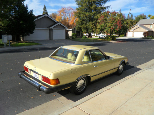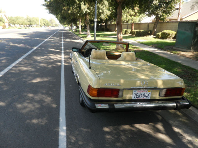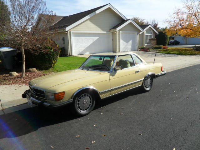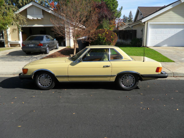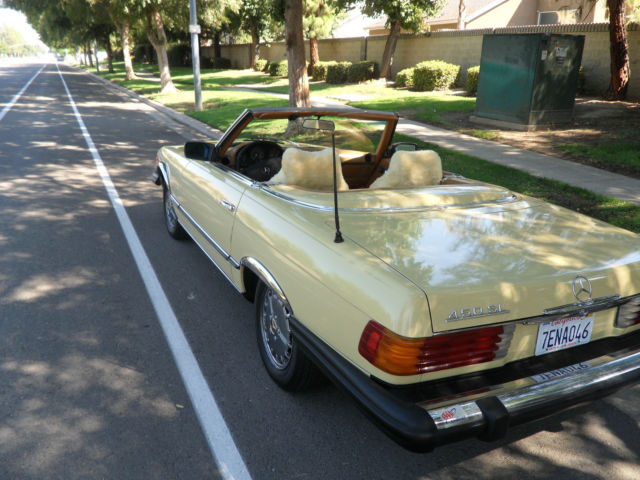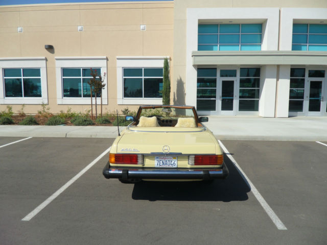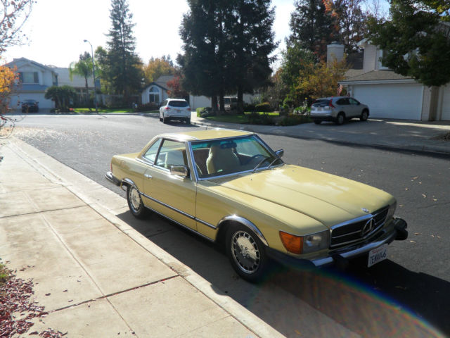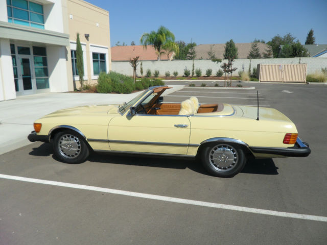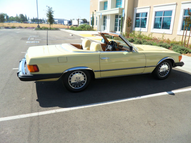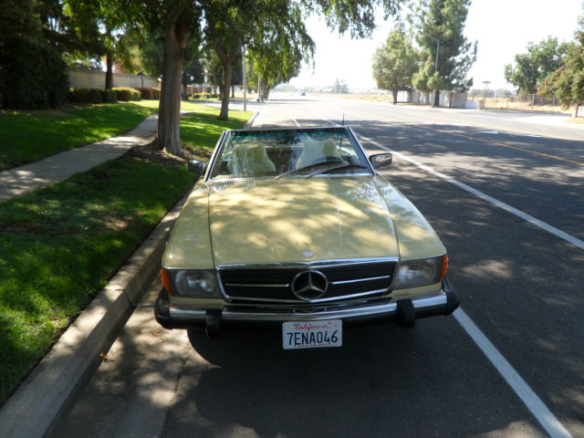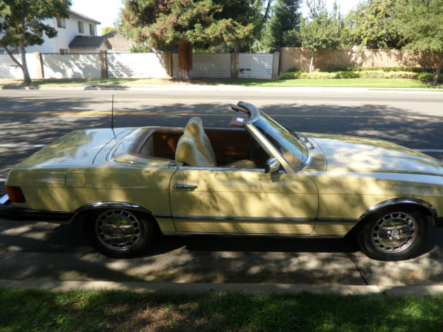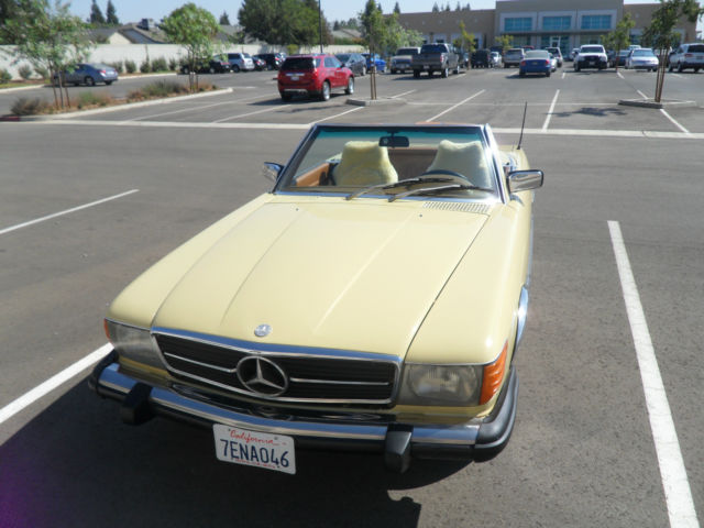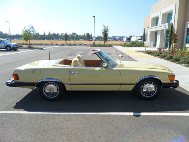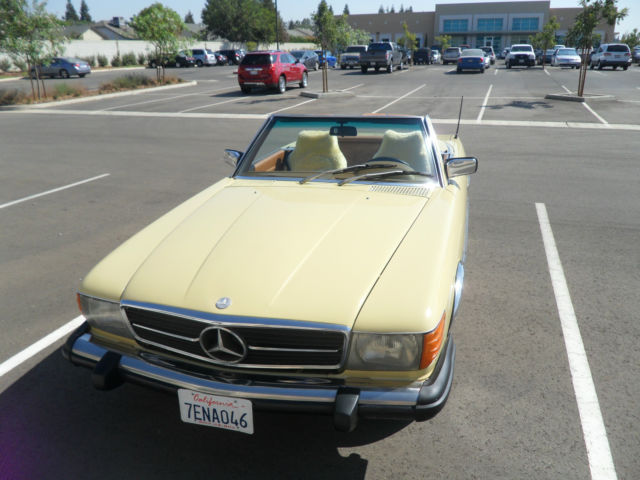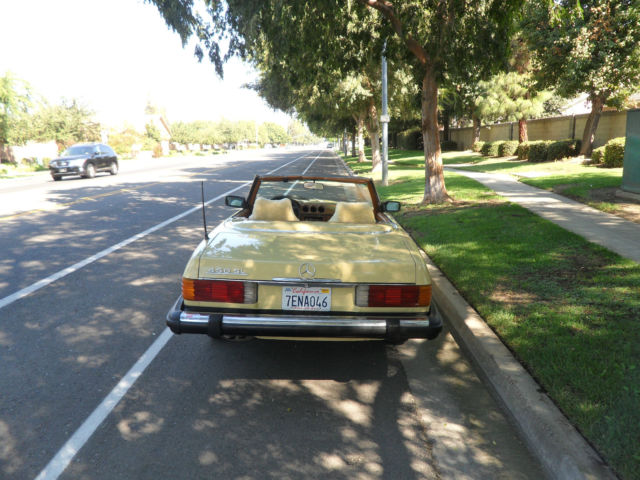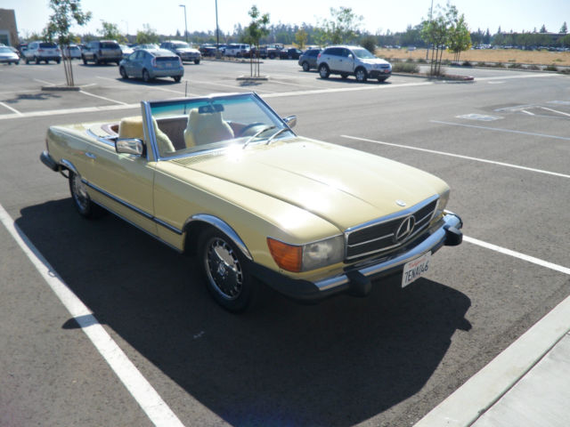 HELLO AND THANKS FOR LOOKING, THIS IS A NICE 1979 MERCEDES-BENZ 450 SL YELLOW 2 DOOR CONVERTIBLE COUPE/ROADSTER. THIS CAR HAS 171,411 MILES WHICH IS 4,895 MILES PER YEAR, AS THIS CAR IS 35 YEARS OLD AND A CLASSIC. I JUST HAD THE OIL CHANGED AND IT HAS ALWAYS HAD REGULAR MAINTENANCE WITH A TOP MERCEDES MECHANIC. THERE ARE NO DENTS, PAINT JOB IS STILL NICE AND ALSO IT HAS A NEW PIONEER STEREO WITH NEW KENWOOD SPEAKERS FOR CRUSIN! THE CAR HAS ALMOST NEW TIRES, ONLY A 1000 MILES ON THEM, IT COMES WITH A NICE HARD TOP AND ORIGINAL BROWN CONVERTIBLE TOP THAT IS IN GREAT SHAPE. CAR IS ALL ORIGINAL EXCEPT THE STEREO AND SPEAKERS AND IS READY TO GO UNLESS THE WINNING BIDDER WANTS TO RESTORE IT TO BECOME A SHOW CAR. THE CAR HAS ALWAYS BEEN GARAGED AND IS A CALIFORNIA CAR. EVERYTHING WORKS ON THE CAR EXCEPT THE AIR CONDITIONER IS BLOWING OUT HOT AIR, CLOCK EVEN STILL WORKS. THE BROWN LEATHER SEATS DO HAVE SOME WEAR AND I WOULD RECOMMEND THEY BE REDONE. NADA PRICE GUIDE LISTS THE THE LOW RETAIL AT $11,700, THE AVERAGE RETAIL AT $22,000 AND THE HIGH RETAIL VALUE AT $32,000. I WOULD RATE THE CAR BETWEEN LOW AND AVERAGE RETAIL PER THEIR VALUE TYPE DEFINITIONS. CAR WILL BE SOLD AS IS DUE TO IT BEING A 1979 AND 35 YEARS OLD, I TRIED TO DESCRIBE IT AS WELL AS POSSIBLE AND TOOK SEVERAL PICTURES OF THE ENTIRE CAR. YOU ARE WELCOME TO SEE THE CAR IN PERSON, TEST DRIVE IT ETC., THE CAR IS LOCATED IN CLOVIS CALIFORNIA. I HAVE CLEAR TITLE, TAGGED UNTIL JULY OF 2015. A NON-REFUNDABLE $1000.00 DEPOSIT WILL BE REQUIRED WITHIN 48 HOURS OF THE END OF THE AUCTION AND CAR MUST BE PICKED UP OR SHIPPED WITHIN 7 DAYS OF THE END OF THE AUCTION AND ARRANGED BY THE WINNING BIDDER. WE WILL NOT TURN OVER THE PINK SLIP UNTIL PAYMENT HAS CLEARED. PLEASE EMAIL ME WITH ANY QUESTIONS YOU MAY HAVE? THANKS AND GOOD LUCK. Note: We reserve the right to end this auction and sell locally before the last 12 hours, as car is on Fresno Craigslist for $9500.00 and we are getting several calls etc. Thanks