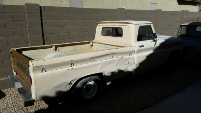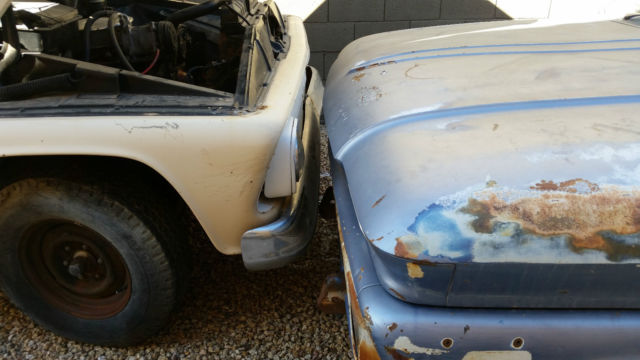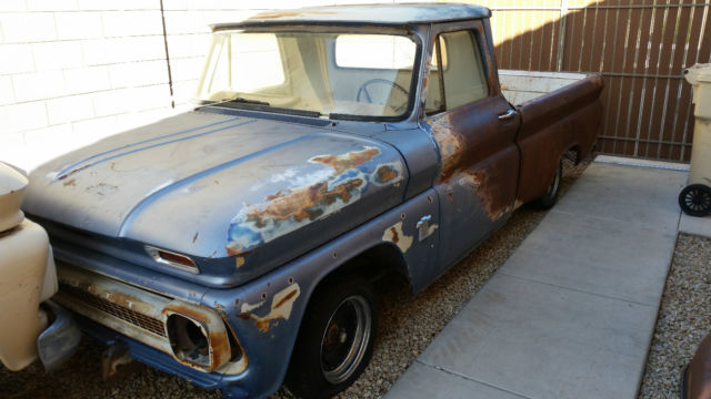 Please read all information before you call, text, or email with questions. You are buying 2 trucks located in Phoenix, Arizona. One is a 1965 Chevrolet C10 long bed with a newer Target 350 and 350 automatic transmission. The second truck is a 1964 Chevy C10 2wd with NO DRIVE TRAIN. The real money in this deal is the fact you can build the short bed with the drive train from the long bed and still have a long bed truck to sell or use as parts. Both trucks are from Arizona and have very little rust. The 1965 long bed will need a new passenger side bed side due to damage from previous owner (restored salvage title). The frame and rest of the truck is perfect. The long bed has a Target 350 engine, R134 A/C and under the dash controls, a 350 automatic transmission, great looking bench seat, and decent carpet. The truck is complete and missing nothing. Truck could easily drive if needed in one day. This truck comes with an Arizona title. I consider this long bed the donor truck. The 1964 short bed C10 is the builder. All body panels are good with no complete replacements needed. The truck has both front and rear bumpers (rear bumper in bed of truck). The truck has great patina. YEARS AND YEARS ago the truck sat next to a car that caught fire. The blue paint pealed and that is why you see surface rust on driver's side. The panels are in great condition. The only rust is in the floor board on the driver's side (see picture). The truck will need a custom suspension or use the suspension from the 65 long bed. Someone cut the coils at one point. I would swap the windshield with the 65 because of a small crack, all other glass good. This truck comes with an Arizona Department of Motor Vehicles Bill of Sale (VIN # 4C144H168209). I know you will have shipping costs. I am a reasonable person. Make a reasonable offer and maybe we can come to terms. If you have any other questions, please call or text. I can also record a short walk around video if needed. If you would like a more specific photo, let me know. Mark or Libby 623 451 0221
