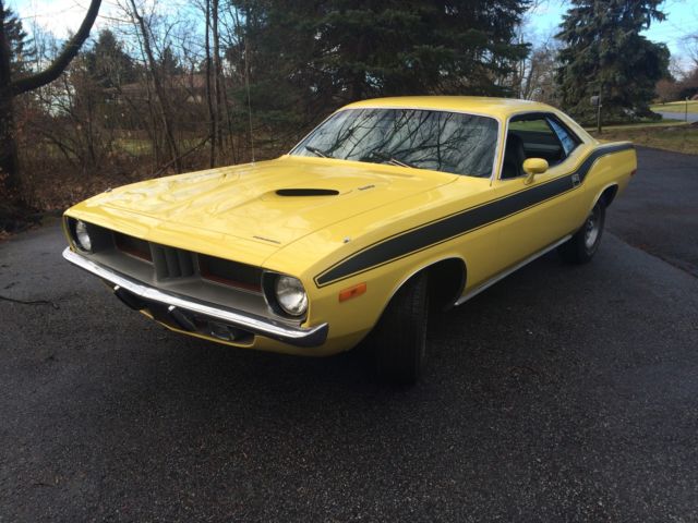 For sale is my 1972 Cuda factory lemon twist yellow. This car has the original numbers matching 340 and factory 4 speed as well as sure grip 3.55 . The car has all original body panels and floors, the trunk was replaced with a AMD 1 piece trunk. The car has had one repaint and still has a very nice shine there are a few chips and one small ding the size of a finger tip. The interior is in good shape with a new headliner installed in the last 2 years. The carpet is original and has some fade, seat are nice little to no wear and no rips or tears anywhere. The drivers side door panel has some scratches and the dash has a perfect fit dash top. All chrome is nice and all glass except front windshield are original tinted glass. All lights, signals, horn, wipers, gauges except Tach, and clock work, The speedo Jumps around a little. The body is very straight and all gaps are very nice, no sag in doors very nice body and a perfect grill no cracks. The bottom of the car is perfect only one small spot of rust the size of a finger tip and only surface not rot. The frame rails, rockers, floors are all rock solid. The motor and trans run great and car tracks straight down the road. The motor has an aluminum intake and holley carb other than that all original down to the manifolds. The engine compartment is very nice could use a nice detail, but in great shape with vin stamped on rad support and cowl. This is a great driver and I don't consider it a show car but if you want a car that you can jump in and run down the road and get thumbs up and smiles this is the car. Don't miss you chance to get a very rare color and numbers matching Cuda for the price of what some people are asking for clones. I have taken over 100 pictures and have tried to describe every flaw in the car, please allow all photos to load and then scroll down. The car is for sale locally and I reserve the right to end the auction early.