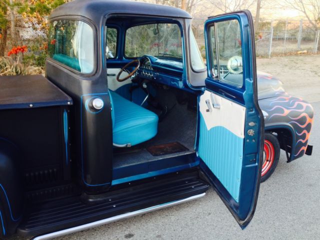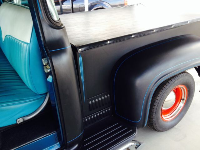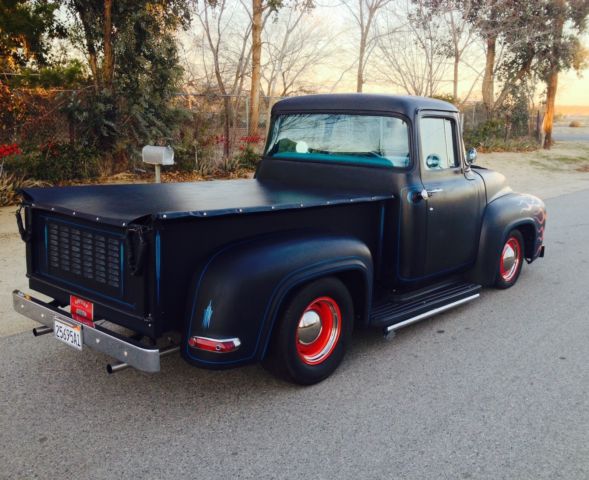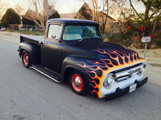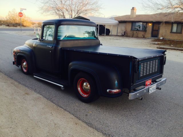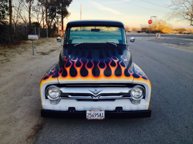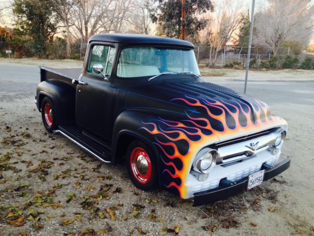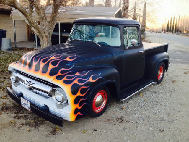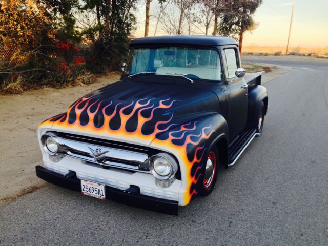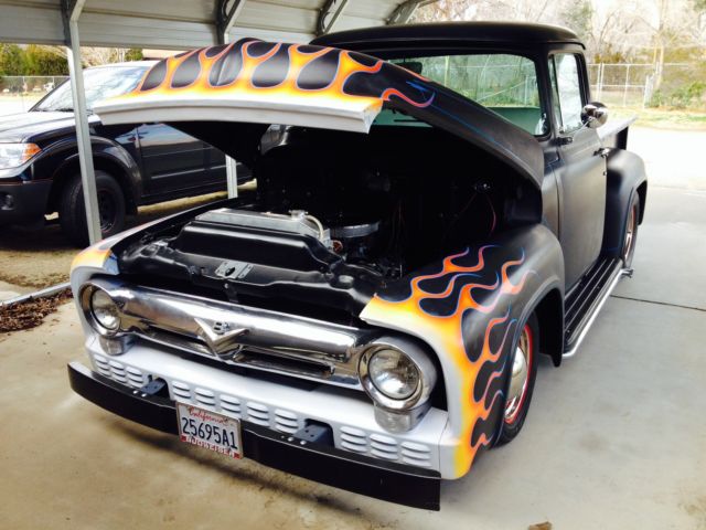 56 F-100 built from frame up, rebuilt Chevy engine, mild cam, Holley carb, SS custom headers, smitty glass packs. Muncie 4-speed, mor-drop front axle with disk brakes, Lincoln Versailles disk brake rear. Dual master cyl under floor, not power. All bodywork has been done, all rust spots metal filled and patch panels. Very basic hot rod wiring, fuse panel. nothing fancy Cab was in very good condition, media blasted and bigwindow clip installed. Factory metal part installed and finished like a stock truck. New cab mounts. Frame is boxed at front of cab. All brand new glass and rubbers installed. New wood in bed. Black is epoxy primered. All bodywork is done. Stock steering, was planning on adding power steering box. Truck is not finished, just in epoxy primer. Flames and Pinstriping were just added because that's what I like. Wouldn't take much to get in the paint booth and painted. All holes were welded up or patch pieces and filled. Lake pipes are hooked up and there are spark plugs in the tailpipes to hook up flame throwers. Headliner in not done, I have a piece of white leftover for having it installed. Buyer is responsible for arranging for shipping. I can trailer up to 200 mi for a fee. Email with questions and more pictures. I have all pics of the build and what's installed. Cash or Certified Check or money order. Buyer will arrange all shipping and or local pickup. All shipping costs by Buyer. $500.00 non refundable deposit due within 24 hrs of auction end. Arrangements must be made in 7 days of auction end. Reserve the right to end auction early, truck is also for sale locally. Sold As Is!! Where Is!!! You are welcome to come and inspect and drive the truck if you would like. Must set up a appointment. Or have someone come look at Truck is being re-listed, buyer accidentally hit the buy it now button, this time it is a auction format. If you have a very low feedback score you need to email me before you bid or your bid will be deleated. Thanks for looking.