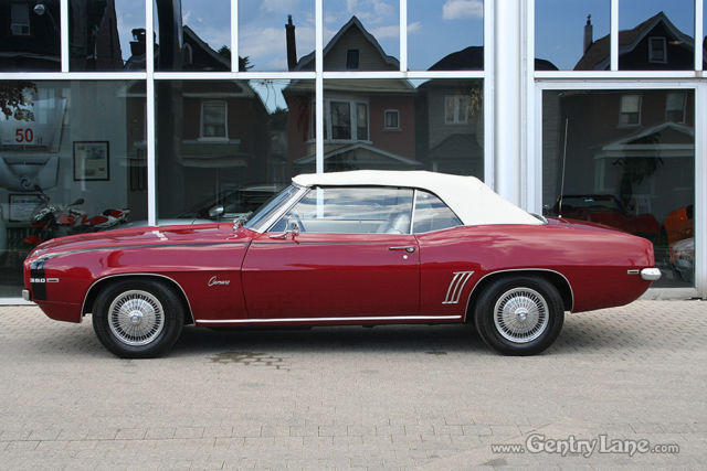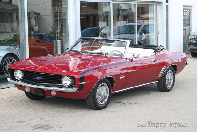 1969 Chevrolet Camaro Convertible This auction is for a 1969 Chevrolet Camaro Convertible . The first-generation Chevrolet Camaro appeared in dealerships on September 29, 1966, for the 1967 model year on an all brand new rear-wheel drive GM F-body platform and would be available as a 2-door, 2+2 seat, coupe or convertible with a choice of six-cylinder and V8 powerplants. The first-gen Camaro would last up through the 1969 model year. The basic engineering of the Camaro was a unibody structure from the windshield and firewall back, with a separate steel rail subframe for everything up front. Double A-arms made up the independent front suspension while the solid rear axle was suspended by semi-elliptical leaf springs. Bolero Red 1969 Chevrolet Camaro Convertible . Original deluxe white vinyl interior and white soft top. This Camaro is equipped with a 350 cu in (5.7 L) small-block V8 engine producing 300 horsepower, backed up by a automatic Transmission. 87,400 miles. Equipped with power steering, power disk brakes, and a CD player. A real âOutlawâ show car with lots of excitement built in. TERMS : This auction is in U.S. dollars. Bidders are welcome to inspect the vehicle anytime during auction. Payment is due in full within 3 business days of auction closing. Cash, Certified Funds and/or Bank Transfer will be accepted. If paying by personal cheque the vehicle will be held until it clears. Please bid only if you are serious and understand these terms. Your bid signifies your agreement to these terms. Please feel free to contact me at (416) 535-9900 or on my cell phone at (647) 221-8381 . Vehicle is located at Gentry Lane Automobiles - 770 Dupont Street, Toronto, Ontario. We can help arrange delivery of the vehicle, by experienced carriers to anywhere in the world.