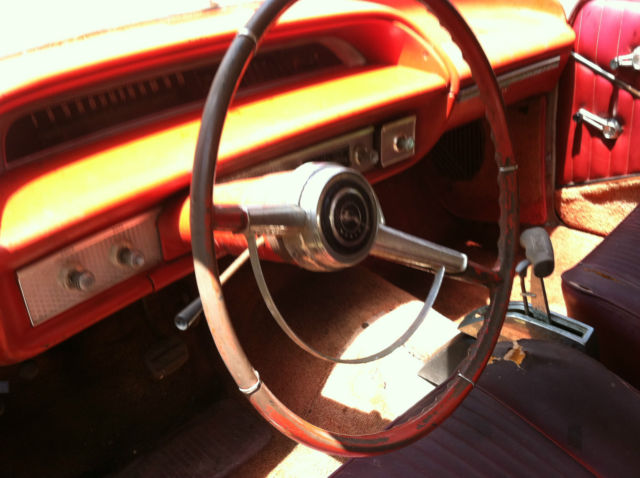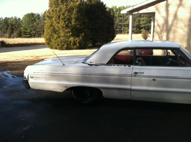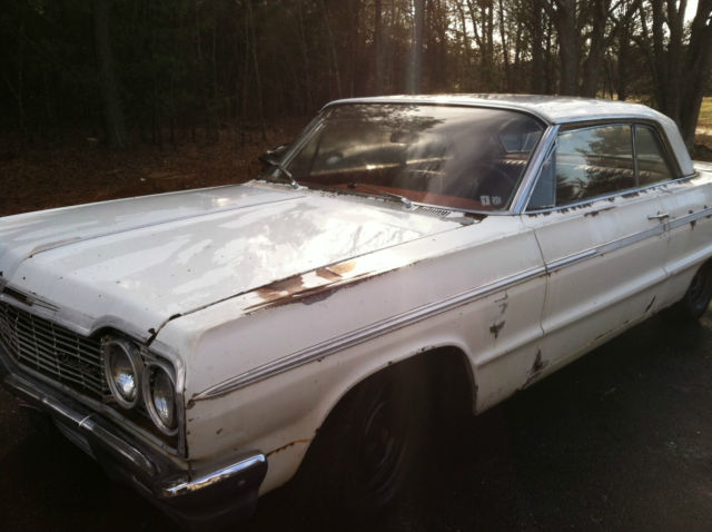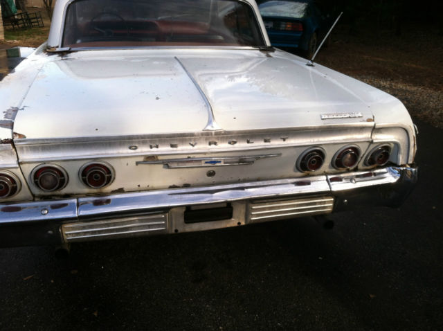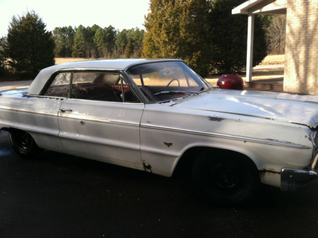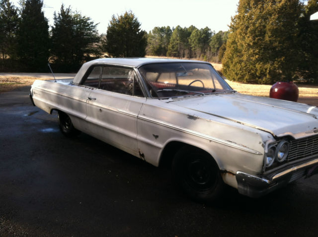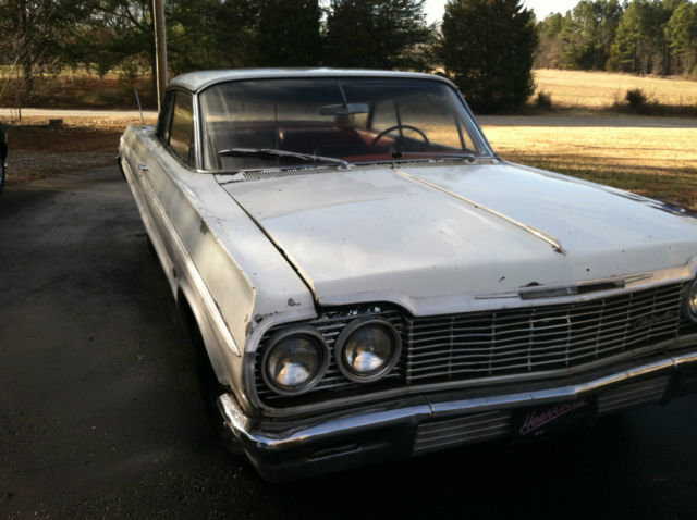 A wonderful classic car, ready for an amazing restoration! A 1964 Chevrolet Impala SS! This is the 2-door model which is so popular to muscle car renovation enthusiasts. Interior is in great shape for its' age, the dash is very clean and all the original interior parts are on hand. The original cloth headliner is falling down and there are some tears on the seats. The exterior has a lot of surface rust and there are patches of rust through the front fenders at the bottom. There is a small crimp in the body at the right rear just above the bumper. The drivers' window works but may need a new roller. The engine is a small block Chevy 350 with a quadrajet carb, block casting number 3970014 (this is a 1968-1979 350cid). We have cleaned up the engine, installed new tune up parts, and it IS RUNNING!!. The transmission works and shifts. The original shifter and console will come with the car. The carb is iffy, could use a nice Holley. There is dual exhaust and a fresh battery. The tires need to be replaced but they are holding air. The transmission is automatic but I don't believe it is original to the car. The engine is definitely not original, the vin states that this car was an original Impala SS that came with a six cylinder motor. The floor pans are not rusted through and the trunk pan is intact, however, the trunk weatherseal has rusted away the metal lip under the rubber. This car has no power steering and no power brakes. The brakes work, but there is a bad master cylinder seal and fluid drains over time. Fuel gage works. Has original radio. I have a South Carolina Title in my hand waiting to sign it over.