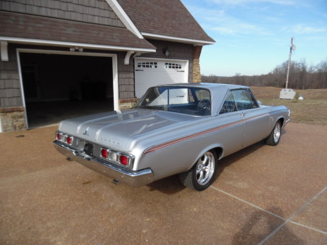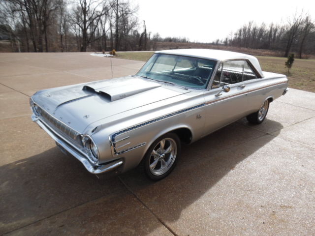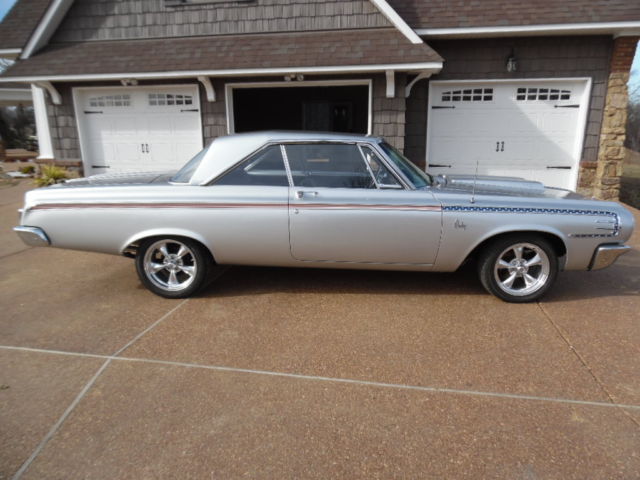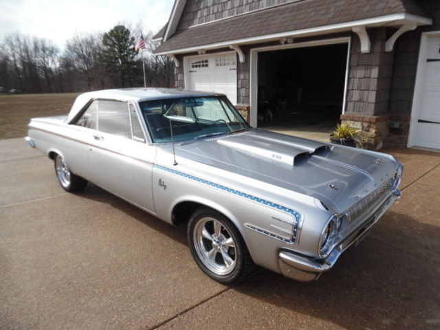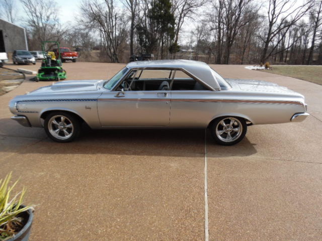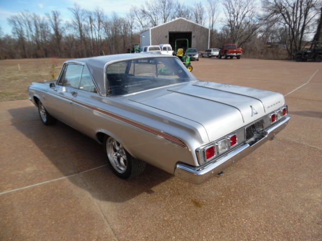 USED 1964 DODGE POLARA 440 ENGINE 727 AUTOMATIC TRANSMISSION THIS CAR HAS NEW 17" AMERICAN RACING WHEELS 4 BRAND NEW 17" NEXEN TIRES, NEW CHROME BUMPERS , NEW HEADLIGHT RINGS , NEW TAIL LIGHTS ,w/ NEW CHROME BEZEL ,NEW CHROME TRUNK LOCK HAS A NEW BEAUTIFUL METALLIC SILVER PAINT JOB . BRAND NEW POWER FRONT DISC BRAKES. THIS ENGINE ONLY THE CAR WAS COMPLETELY REMOVED AND TOTALLY REBUILT WITH A LARGER CAM. THE ENGINE WAS PAINTED HEMI ORANGE AND TOPPED WITH NEW EDELBROCK POLISHED ALUMINUM INTAKE. NEW POLISHED EDELBROCK ALUMINUM BREATHER NEW HOLLEY 4 BARRELL CARBURETOR , NEW POLISHED HEADERS WITH NEW DUAL EXHAUST AND FLOW MASTER EXHAUST NEW MSD IGNITION WITH NEW MSD DISTRIBUTOR NEW HOOD INSULATION ALL NEW PLUG WIRES NEW BELTS , HOSES. ALL NEW ELECTRICAL COMPONENTS UNDER HOOD NEW CHROME ALTERNATOR NEW MINI STARTER INTERIOR IS ALL BLACK EVERYTHING IS NEW INSIDE DOOR HANDLES AS WELL AS OUTSIDE DOOR HANDLES NEW TRUNK FLOOR PAN AND MATS NEW GAS TANK NEW STAINLESS STEEL GRANT STEERING WHEEL NEW HURST PROMATIC SHIFTER ALL NEW FRONT END PARTS WAY TOO MUCH TO LIST I HAVE INVESTED IN OVER $70,000.00 IN THIS CAR THESE CARS ARE VERY HARD TO FIND AND THE PARTS TO THESE CARS ARE VERY HARD TO FIND WINNING BIDDER WILL ALSO GET THE SPARE PARTS I HAVE BEEN SAVING OVER THE YEARS THIS CAR LOOKS BEAUTIFUL ON TOP AND VERY CLEAR UNDERNEATH NO RUST PLEASE ADVISE WE DO NOT KNOW THE TRUE MILES TO THIS VEHICLE MILES ARE EXEMPT!! READY TO DRIVE OR SHOW THERE IS NOT ANOTHER CAR OUT THERE LIKE THIS ONE !!!! HAPPY BIDDING