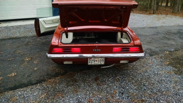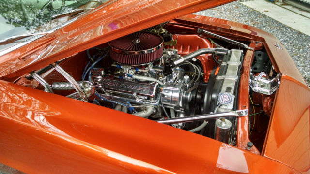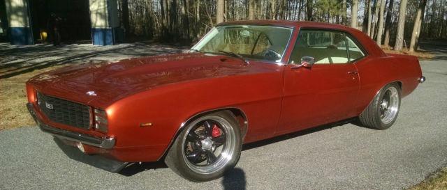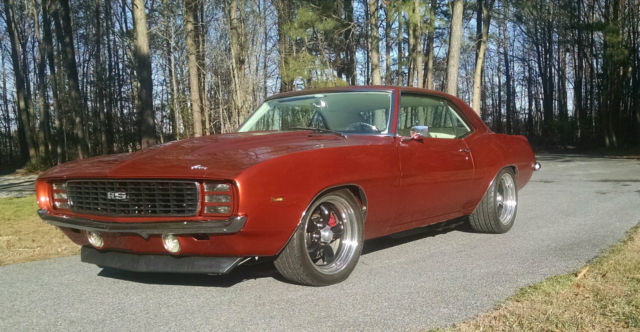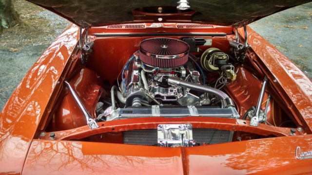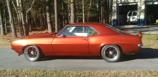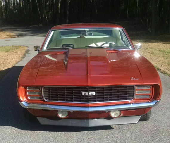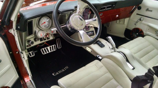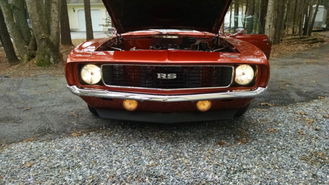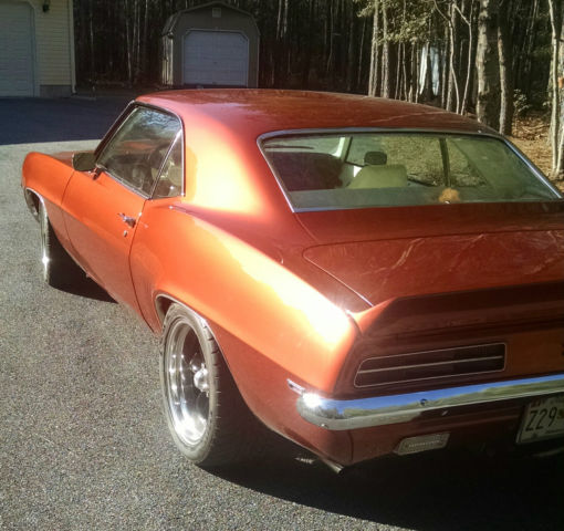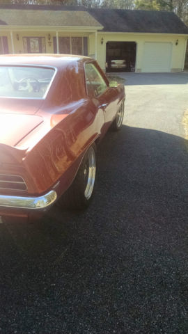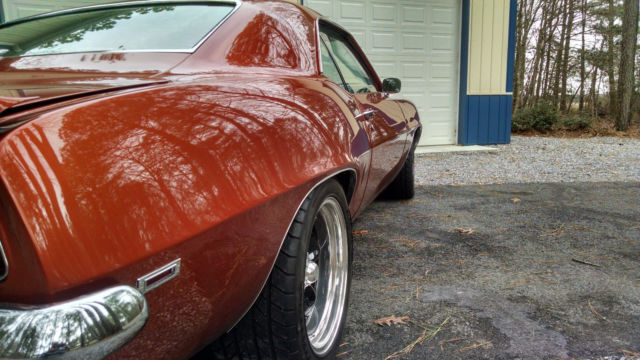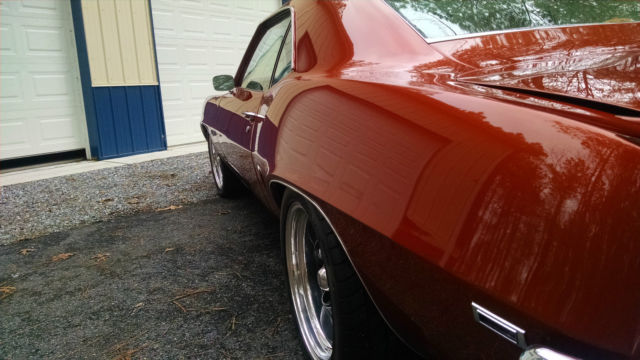 1969 Camaro RS Motor: 416 cubic inch Chevrolet small block Bowtie block Four bolt main Lunati 4340 Crank Oliver 4340 Rods JE Pistons Low 600 inch lift roller cam Roller lifters Roller rockers Sonnys Brodix heads Victor Jr coated intake QFT 750 double pumper All chrome accessories High ratio steering box March power steering pump March Serpentine system Be Cool Aluminum radiator All MSD ignition installed Hooker ceramic coated headers Transmission: TCI 350 turbo streetfighter B&M 3000 Stahl Deep vented pan Rear: Moser engineering custom Ford 9" with 3.25 gears Undercarriage: Sound and heat deadener All braided steel line covered with Cool It covering All wires covered with Cool It covering New 2.5 inch flowmaster exhaust Upper and lower tubular control arms Hodgkiss sway bar and rear leaf springs 17 gallon custom stainless steel fuel tank with lower sump 2" lower blocks 17 inch painted Torgue Thrust II rims BF Goodrich tires QA1 adjustable spring\shocks upfront QA1 shocks in the rear Interior: Covans dash with Autometer gauges All gauges work No A\C White leather Corbeau seats Custom made matching back seat New carpet Sound and heat barrier underneath carpet New headliner Custom console with cd player Paint: Tangerine Pearl New Goodmark Quarter panels,fender and hood LED lights throughout Contact Information: James at 443-988-8991 booth_james@juno.com FOR SALE $52,500 or Best Offer