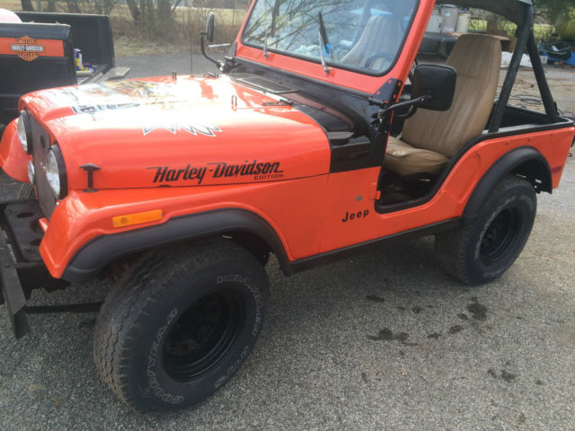 1978 Jeep CJ5 Harley Davidson Edition 50927 Actual miles. Thats right 50000 original miles Drive this jeep the steering has no play or road walk what so ever The engine looks new Paint is great shape a scale of 1 to 10 its an 8.5 Runs and drives great gauges work even the gas gauge 4x4 all works as it should. no top only the bikini top as shown any questions call hutch 6066154105 tires are 75% tread frame is spotless no rust on the body keep in mind this is a 35 plus year old vehicle it is in great shape but it isnt a new jeep please understand this if your interested make arrangements to come and look at the jeep before bidding and take it for a drive On Jan-31-15 at 12:15:31 PST, seller added the following information: SAVE MONEY ON SHIPPING! uShip is the first and largest auction style marketplace for shipping and transportation services. Learn More SHIPPING PRICE ESTIMATOR Delivery ZIP Code: MORE RESOURCES: uShip Guides and Articles uShip Provider Directory Other Useful Tools & Links