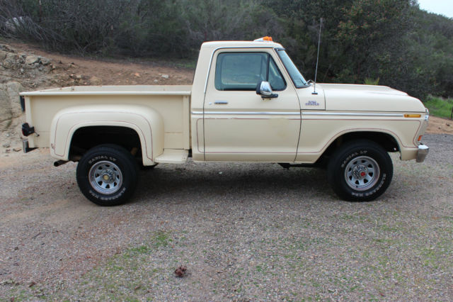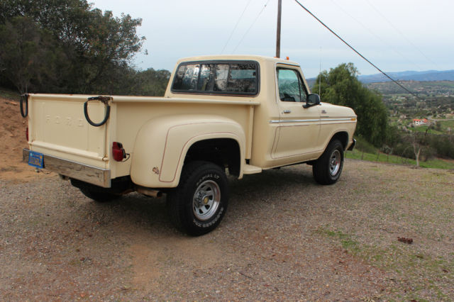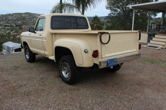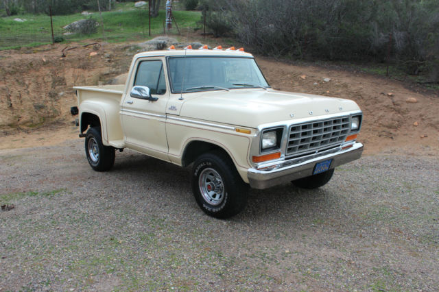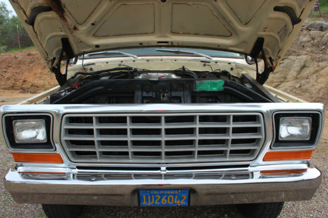 Hi you are looking at a 1979 f150 4x4 shortbed step side with a 351v8, auto trans, tilt, AC ps, pb, Truck has 92k original miles and everything works Ac blows cold all the gauges work, all lights and blinkers work, The interior is Immaculate the seat almost looks like new. Window roll up and down like new, all glass is good. All original running gear The truck is very straight and paint is decent the and a few small dings and some scratches. Truck runs and drives very nice. All the chrome and side trim look like new the rear bumper is custom made out of a piece of 2x6 box the corners are beveled and welded ground smooth and chrome plated and a custom hitch welded to it also plated very nice combo. The wood bed has been covered with a piece of plywood and some of the original boards are rotted. the is very little rust in this truck. All the 4wd work like it should shift easy and the hubs lock. The wheels are original and the center caps and beauty rings are very nice. The exhaust is original and in very nice condition. Has a brand new battery. The carb has been rebuilt. I bought the truck from the grandson of the guy that owned the truck his grandfather died and he got the truck. Glenn 760-315-2712 On Jan-28-15 at 18:19:11 PST, seller added the following information: I forgot to take a picture of the data tag that shows everything is correct like the wheel base of 117 which is a shortbed. If you need a pic let me know Also the truck was repainted On Jan-30-15 at 06:53:36 PST, seller added the following information: Also The truck has a set of 1956 F100 tailights on it and I have a brand new set of lenses that go with the truck