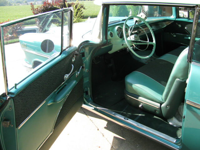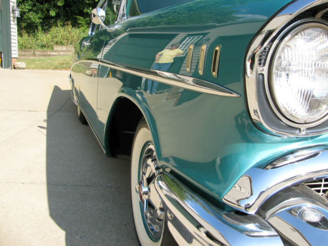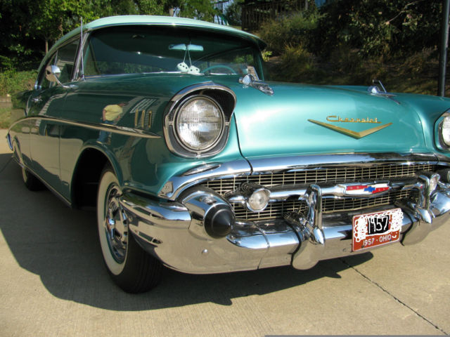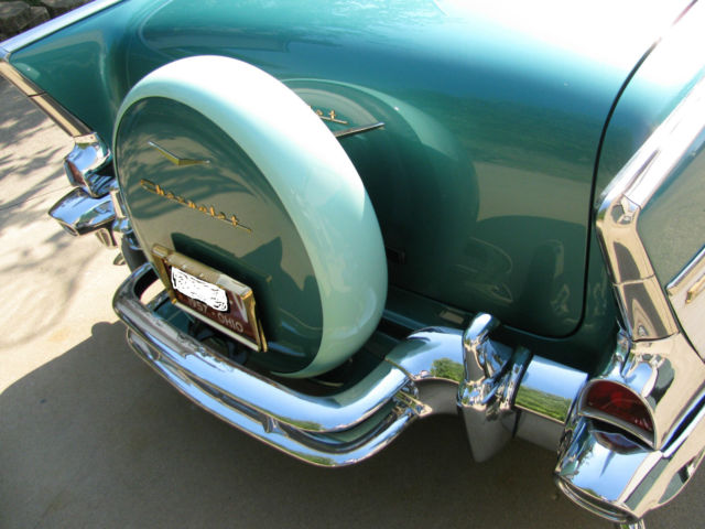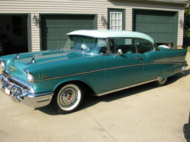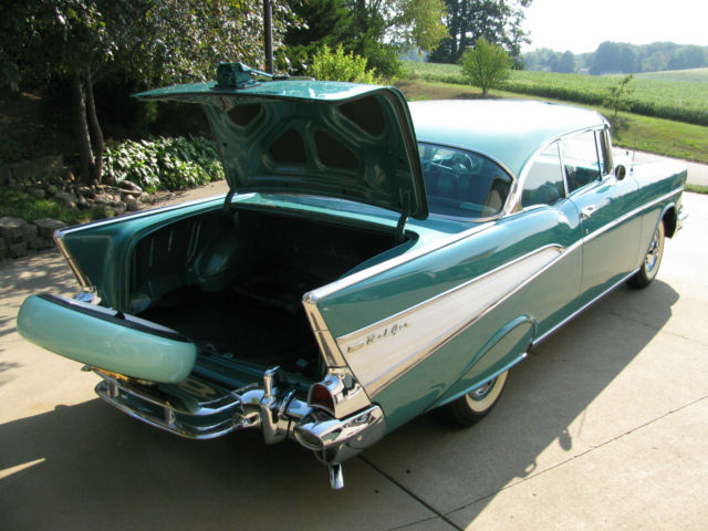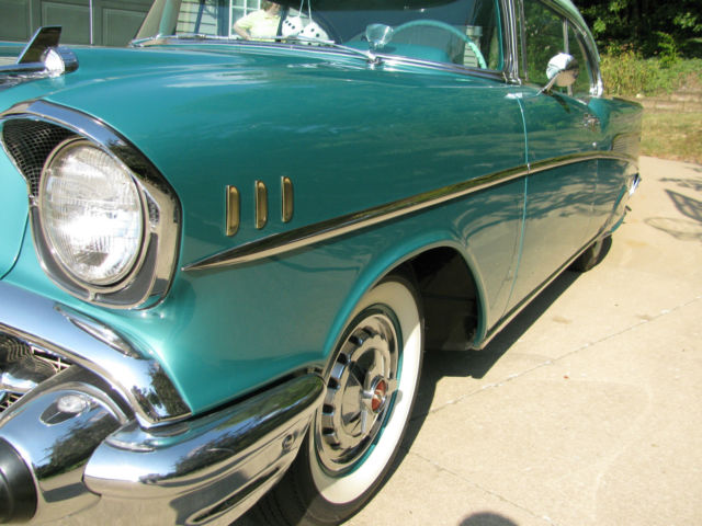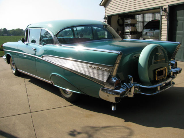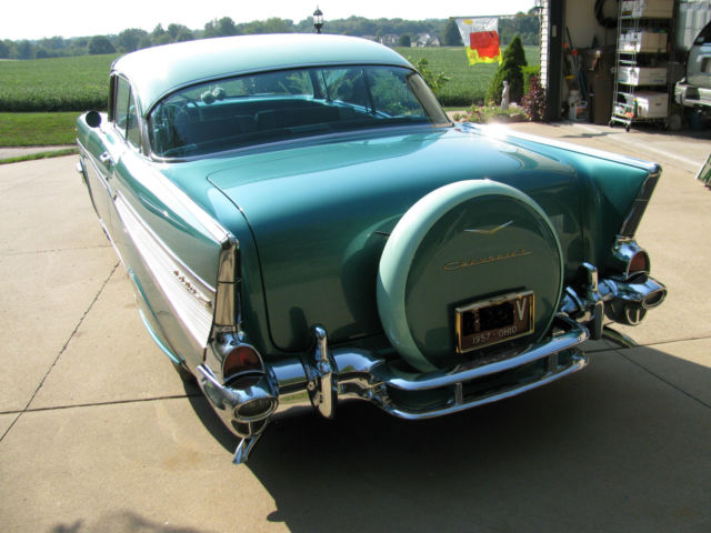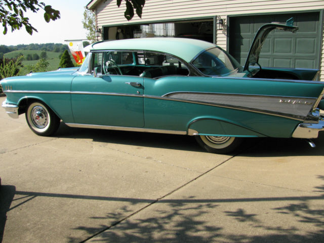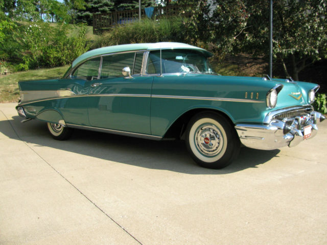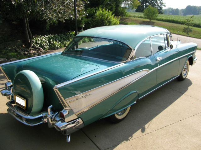 Here is a BEAUTIFUL 1957 Chevy 2 door hardtop . I am listing this for some friends , they have owned this outstanding Classic Chevy for about 20 years . It features a Power Pack 283 engine , with a powerglide transmission . Power steering , manual brakes . It has rare options too .... Out side windshield visor , tissue dispenser , vacuum ash tray , fender skirts , and factory continental kit. The body has always been in great shape , one quarter panel was replaced (full) when it was restored , as not to fill in a minor boo-boo. It is painted in the 57 colors of highland and surf green. Different from every red one you see at a show ! Complete new interior , paint , tires , chrome ,etc. It was restored several years ago , but looks like it was done yesterday . The pictures just don't do it justice . It looks and runs just like it should . It was undercoated as to preserve it , so it could be driven and enjoyed . If you are looking for a really sharp classic to cruise and show off - YOU HAVE FOUND IT !!! It is for sale locally , we reserve the right to sell it at any time . If you have a question - PLEASE ASK , don't assume . If you want to inspect it , just contact us , and we can arrange it . PLEASE - be serious bidding as we are serious about selling it . A $500 deposit (by paypal ) must be done within 24 hours of the end of the auction. Balance due upon pick-up. ALL FUNDS TO BE PAID IN FULL BEFORE IT LEAVES THE PROPERTY !!!!