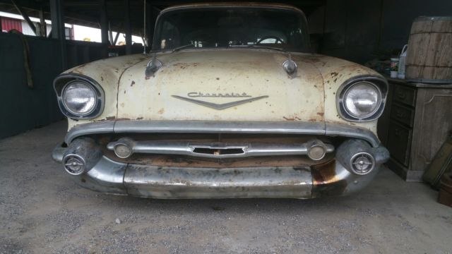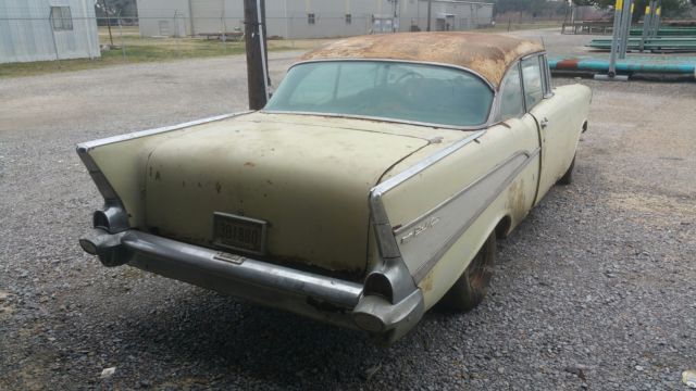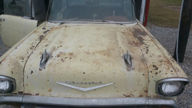 This car is back for sale due to winning bidder backing out. Please do not bid unless you have the funds to purchase it if you win. Up for auction is a 1957 Chevrolet Bel Air 2 door hardtop. Car has been sitting in an old garage since the late 70s sometime. This would be a full project car as you can see from the photos. The car needs new rockers, lower doors, floor pans, trunk lid and needs other spots repaired from rust as well. The car has a 350 in it with Muncie 4 speed on the floor which was done in 70s before it was parked. Car does come with clear Louisiana title. I do not have keys for the car though as they were lost. Feel free to ask any questions if needed. Good luck bidding. Also as pictured there are trim pieces not on car but they come with it as well as some extra pieces. Car was red before it was painted yellow in the 70s.