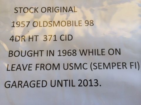 1957 Oldsmbile 98 4door hardtop v8 371 cid Rocket engine with automatic transmission California car a few small rust spots on inside trunk lid and inside hood. none on exterior of car. electric windows original interior in good condition new dash runs great very strong muscle car. This was the top of the line Olsmobile in 1957. It has features that most new cars today do not have such as an automatic light dimmer. I bought it for my mom while I was at home on leave from the Marines in December 1968 during the Tet offensive of the Vietnam conflict (see original sales invoice in pictures). I am second owner. There is some small piting on some of the chrome. The center of the rear bmper has a dent that needs repaired. I did not repair the dent because there is a bumper sticker on it that advertised KZAP radio which was an underground radio station located in Sacramento, California and no longer in business. The station played "radical hippy music" played by the likes of Jimmy Hendrix, Janice Joplin, Doors, Cream etc. and antiwar music. So I liked the sticker and chose not to destroy it. The car was garaged most of the time and is basically in all original conditon. STOCK. Because this car was built by the same company that built the 1957 Chevrolet (General Motors) many of the parts are interchangeable, so parts are easy to find. There is a business Near Costa Mesa California called "Danchucks" which carries many of the parts. This car is complete with original rocket style hood and fender orniments and rear view mirrors. Any questions please call me at 909 593 0548 Fred Stillions