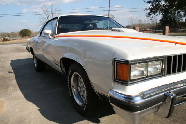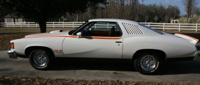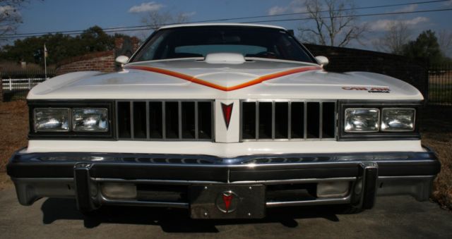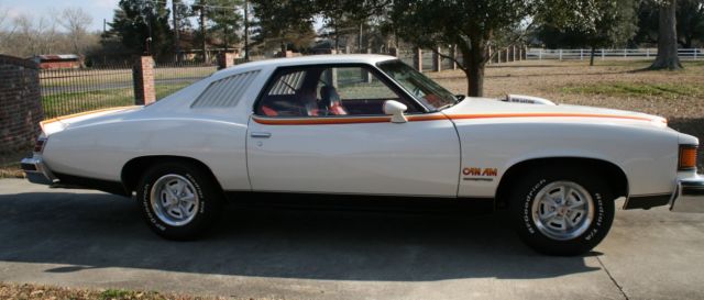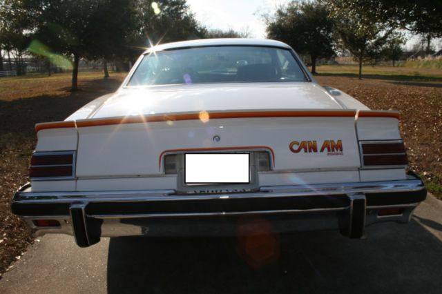 This is a very rare 1977 Pontiac Can Am, 1 of 1377 made, Interior , and exterior are in like new condition, equipped with Power steering, Power brakes, Am/FM stereo, A/C, less then 1000 miles on engine, transmission rebuild, new shocks, brakes, exhaust, new radiator, and radial T/A tires. Drive train is original, and with the exception of a slightly bigger cam, engine was rebuilt to original. This was a original California car, therefore it is equipped with a 403 cubic inch engine. just some history about the 77 Can Am, Pontiac planned a production run of 5000 units, unfortunately production ended prematurely when the mold used to manufacture the unique rear spoiler was accidentally damaged. These vintage Can Am's will continue to appreciate in value, and one being this rust free and of this quality are getting more difficult to find. I will try to respond to all questions. Richard (225) 603 5000 T/A 6.6 400-cid 4-barrel Pontiac V8 (or Olds 403 if sold in California) Power front disc brakes TH400 heavy-duty automatic transmission Power variable-ratio steering Rally RTS handling package GR70x15 radial tires Body-color Rally II wheels Twin sport mirrors Cameo White paint with special tri-color striping Blacked-out moldings, and black lower body-side accent stripe Grand Prix instrument panel featuring the Rally gauge cluster with in-dash clock.