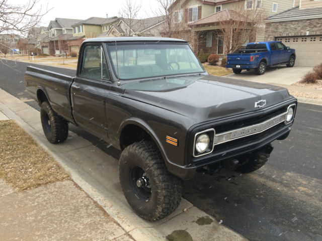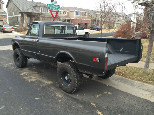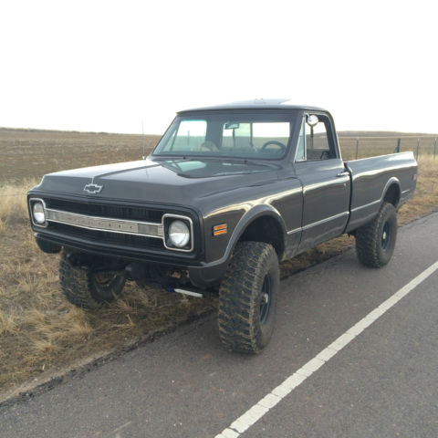 1971 Chevy C10 factory 4x4. Me and my dad recently finished building this truck but I have decided to go in another direction. Recently painted Porsche slate metallic grey, just bought a set of door panels that will need to be painted, new gauge set, new edelbrock 750cfm carb, new edelbrock intake, new exhaust featuring glasspacks with black exhaust tips, all new brakes (including brake booster, master cylinder, front calipers rotors and pads along with rear drum brakes as well), have steering gear box that will need to be installed, brand new rough country 4 inch lift kit, new bf Goodrich 35x12.50x15 km2 mud terrain tires, 15 inch original rally wheels painted black, new starter, new battery, new fuel pump, grill has been painted satin black, new saddle blanket seat cover, new carpet, new sunroof, new windshield, all new weatherstripping. This is not a perfect truck, has very little rust, will need bumpers and a tailgate, transfer case seals are leaking but I have both in my possession. The motor is the original 402, but unfortunately it has a rod knock, so included with the truck is a newly built 454. $1700 was spent building this motor, it is ready to be swapped into the truck. If interested text Trex @ 303-500-2132
