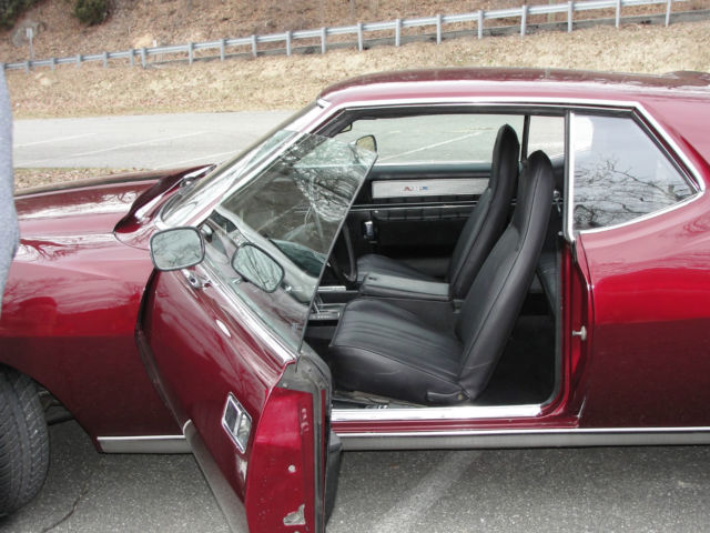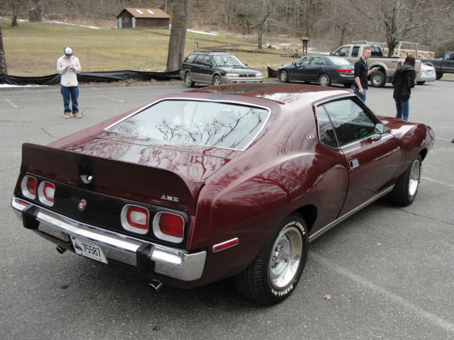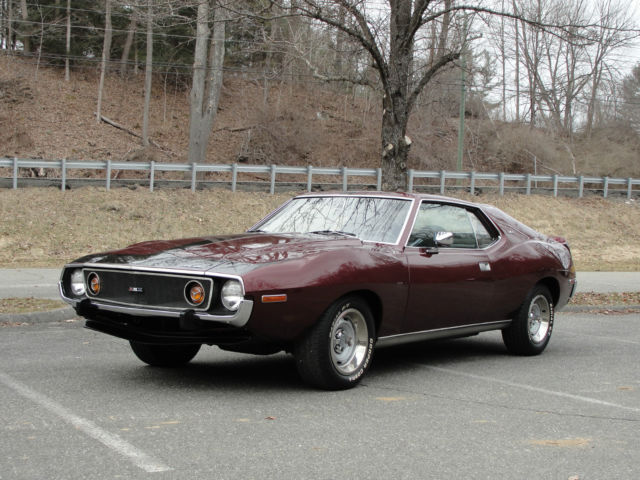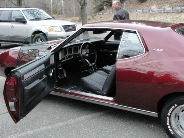 This Auction is for a rare & restored 1973 AMX Javelin. I tâs a beautiful Burgundy color with Black stripe, 2 DR hardtop coupe with an automatic floor shift. The engine is a 360 cu in (5.9 L) V8 245 hp (183 kW) 4BBL completely rebuilt engine with 500 miles on it. It had a completely new paint job done in the last few years. The interior is almost completely redone - I believe it just needs a radio. The black leather upholstery is in great shape. Basically the Javelin runs great, starts right up every time, and has some serious power to it. All the chrome and trim were new and in very good condition. If they have any wear, it should be minimal. It may have some cosmetic blemishes, but it didnât when I last saw it, and it had NO RUST. ***OK***NOTES***PLEASE READ BEFORE BIDDING*** The pictures shown were taken in August 2013 right before I moved to California. It has been stored, covered, and under a roof with friends in New York State since then. Basically, this was my late husbandâs baby and pride &joy that he lovingly restored before he passed away. I really hate to part with it, but if I canât keep it, I would at least love it to go to another Javelin enthusiast. My loss is your gain. So here are my terms: I really donât know much more about the Javelin besides what I have described above. Idk if the car has A/C or power steering, etc. i.e. what options ist has. My description and price are based on what my husband told me before he passed. The price is based on what I was told the car was worth by my husband. Actually a little bit less just to ensure that the buyer is completely satisfied if I missed something. All I know is that this car is sweet to look at, and even sweeter to drive, looks amazing, has a really awesome shape to it, and has no major issues. This vehicle is being sold as is, with no warranty. I really have done my best to represent the Javelin as accurately as possible. Contact me with questions you may have and I will do my best to answer them. If you win the auction and there is an issue, please contact me. Thank you for looking, Good Luck, and God Bless!!!