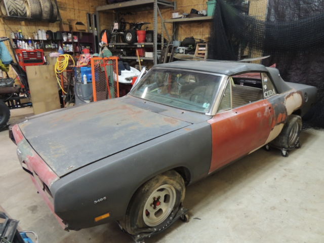 1969 Plymouth Barracuda Convertible NUMBERS MATCHING CAR Original 340 4bl, 727 Column Shift Automatic Transmission If you are looking for a rare car to restore and you are a MOPAR FAN, this is one to add to your collection. It does not need any metal panels, all original body panels, rockers, floors and quarters, etc. Only (125) 340 convertibles were made, and of them only 91 were automatics. Car is original Column Shift, currently has floor shift setup. Here is some information about the car: The 340 has full VIN number on the block (engine is on engine stand and will be installed before pickup) Transmission has no VIN number as most 68 and some 69 727 transmissions did not have VIN numbers. Documented numbers on; engine heads, distributor, intake, exhaust manifolds, quarter panel, etc. Fender Plate Information: L31 M25 R11 V3X V7X END AO1 A04 C55 G15 G33 J25 Y4 H6W X9 809 055125 E55 D32 BH27 P9B 120003 Other Supporting Numbers: Core Support: SS33 ROO / OD 32 3 Rear Quarters: SS-27-R and SS- 27-L also on Right Quarter SWR 30 2, VIN Number on Left Quarter Radiator: 2949066 / 38086 Distributor Tag: Dual Point Chrysler 2642242 / IBS 4013-4 365 Exhaust Manifolds: 2863553 / 08217 and 2863549 / 12268 / 9903 Right Head: 3418915E 01160 AAWJ380 Left Head: 3418915E 01160 AAWJ380 Four Barrel Intake: 2531915-2 Axle Housing: 2070742 no tag found Transmission Tail Shaft: NW-2 / 2463901 with letters DP top row and CD bottom row Has tire pressure/tire size/vehicle capacity sticker on door jam. There are (2) Front Seat Sets to pick from. The rest of the interior is original. Windshield in car is cracked, have replacement from a 1969 donor car. Dash Pad has no cracks, great condition. Only small rust holes , two drivers side floor under pedals, small hole in front right fender and inner fender, and two in trunk, see pictures. Seat rails have rust. What is missing? This is what I know to be missing other than restoration items: carburetor, air cleaner, starter, alternator, backup lights, matching door/trunk key/locks, ignition coil, 5 complete steel wheels, transmission dust cover. No build sheet or window sticker. It has a 1967 front right fender. This is a solid car needing a full restoration. I suggest that if you are interested in purchasing this car, come and inspect the car or have someone do it for you. I have over 130 high resolution pictures of the car that I can email, but you must have a server that takes large emails. I will not resize the pictures. The car is in Ohio with a clear title and shows 76,893 Actual Mileage. Call 937-597-7305 for more information. The buyer is responsible for shipping, the vehicle must be paid for in cash at the time of pickup. No deposit needed, you have 14 days from auction end to pick up, or pay in full and make other arrangements. This vehicle is being sold "AS IS" , "No Warranty expressed or Implied", this is a car that needs a full restoration and does not run.