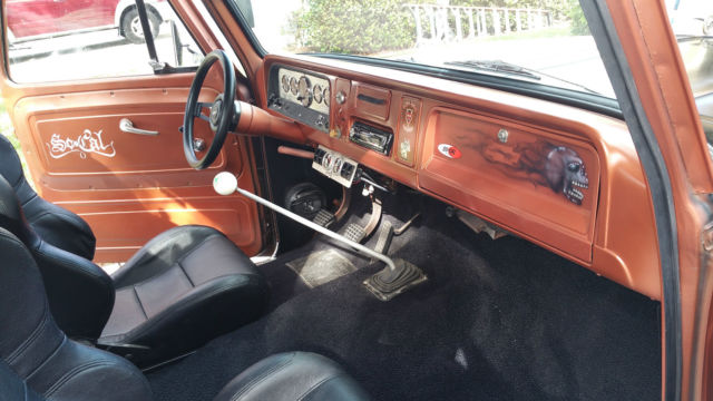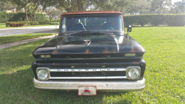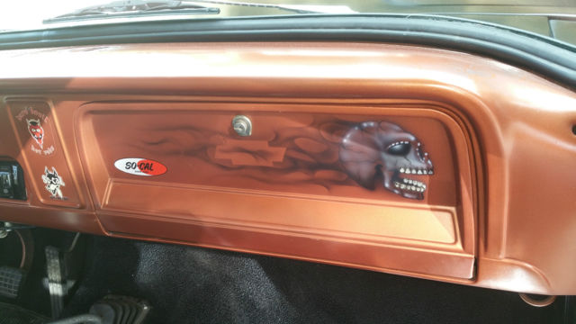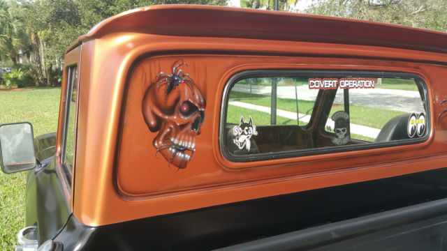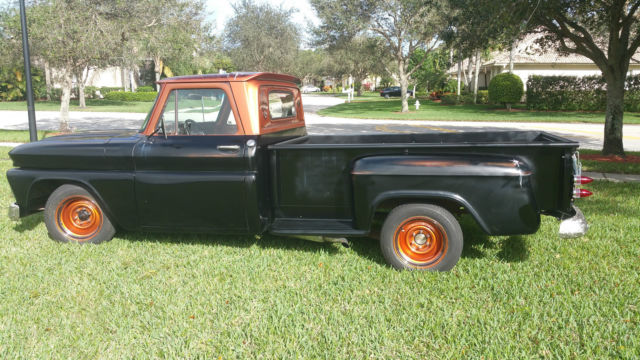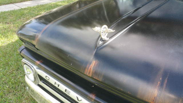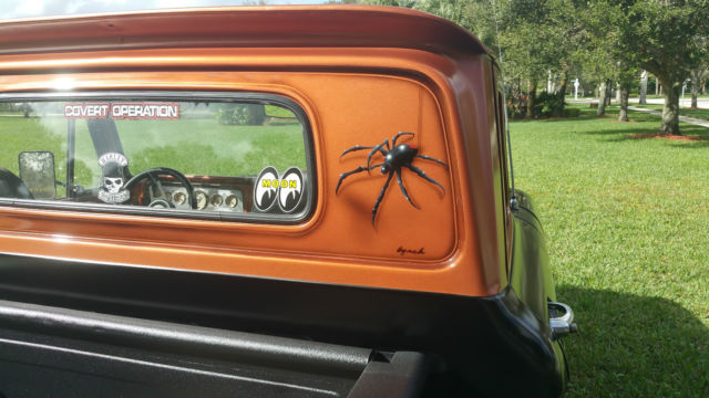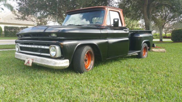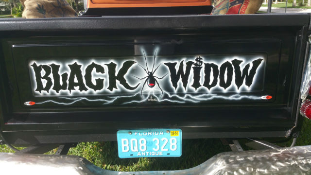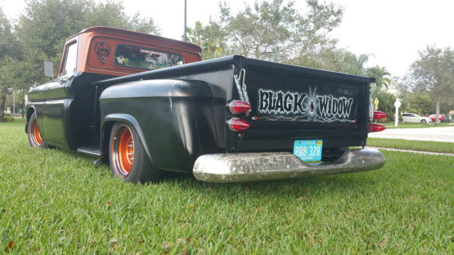 I am selling my 1964 Chevy Step Side Pickup Rat Rod "The Black Widow". This COOL Rat Rod that has So Cal character and done with taste without going over the top. Runs well and reliable cruiser. The resto was done about two years ago. It has a 283 V8 (she smokes a little bit) with Edelbrock carb and a 4 speed manual tranny. NO RUST. Paint was done at time of resto with satin black and Harley orange. There is lots of VERY nice airbrush all over the truck. All the patina and bird $h!t has been airbrushed on as you can see in the pictures. The roof has spider lace with airbrush in the center. She sits on airbag suspension so you can drop her for a low ride and cruise in style. All new gauges, Bluetooth stereo, New gas tank and sender, controls for air ride. Theres also a compressor with a 5 gal tank for the air ride. If you're not going to buy the truck don't make an offer or Buy it Now. Take look at the pictures they say a lot more then I can say and if you have any question you can contact me.