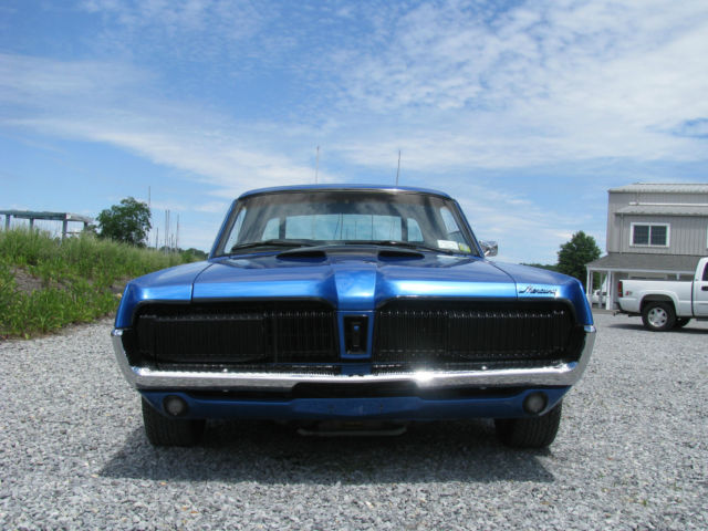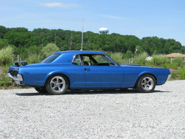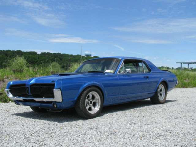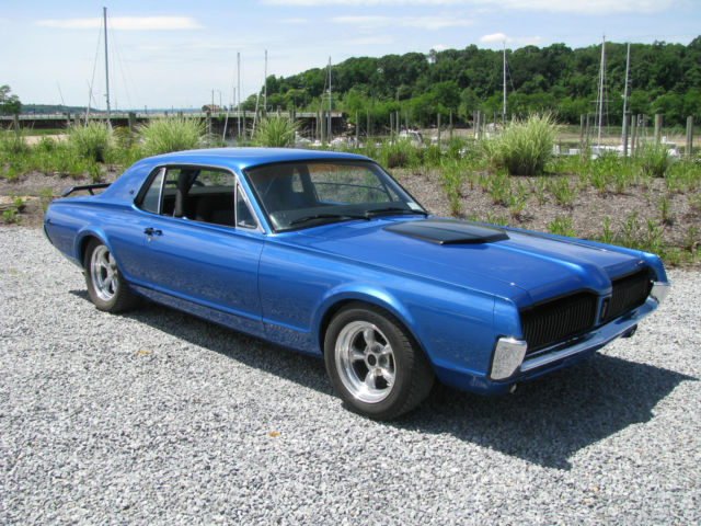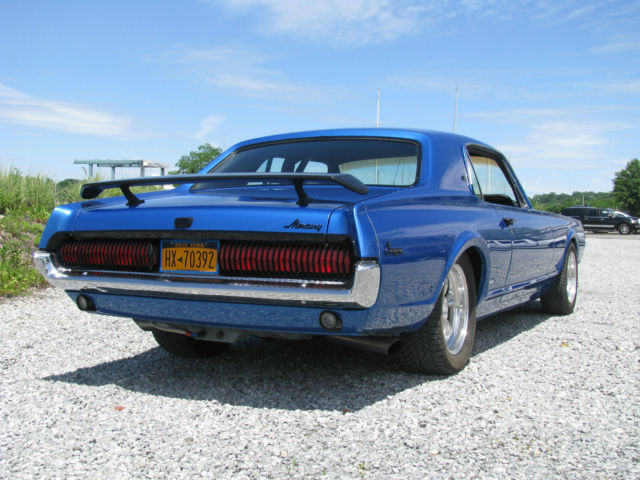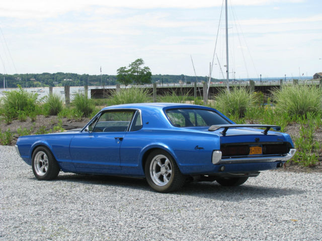 This 1968 Mercury Cougar XR7 has been a one-family California car until two years ago when the current owner and seller relocated it to the East Coast. Converted by the original owner into a road-legal but strip-ready machine. Cosmetics are near perfect and all work was done with an eye towards quality, and further adds that itâs 100% ready to drive and very fast. Paint is without flaws excluding a 1.5 cm mark on the driverâs side front fender where a hose nozzle was accidentally dropped during washing. Lowered over polished Torque Thrusts and with an Eliminator-style rear spoiler, sheet metal is super straight. The motor is a 351 Windsor with a 427 stroker kit built by Speed-o-Motive in Riverside, CA. The cam is a 110 centerlobe 292 duration 540 lift. Sounds very mean!! It has AFR heads victor IR manifold, holly 850 double pumper, speed o motive steel crank and H beam rods, JE pistons, ARP bolts throughout entire motor. Aeromotive fuel system with sump in the original tank. Very well built!! Transmission was built by Art Carr, it is a C4 automatic 2500 stall and a stage 2 shift kit. It has an aluminum drive shaft, good for up to 1000 HP. Original owner had Currie enterprises build the whole back half of the car. It has a Currie rear end with 355 gears and an auburn posi, ladder bar set up with qa1 coil overs on all four corners, goes very straight! Front end is a total control strut front end, top of the line! The custom rear suspension features coil-overs and enlarged wheel wells for additional tire clearance with no fender cutting. Big 3.5â pipes exit either side just aft of the 245/45/R16 Daytona ZR rear rubber, while remaining bright work on the bumpers and around windows provides a welcome contrast to blacked-out Inside, the interior has been largely stripped back to the basics excluding the OEM radio, though speakers are not included. A half cage helps resist twist and provides added peace of mind at the drag strip, aftermarket Pro-Comp gauges replace factory items, a custom switchbox containing controls for âstart/ignition/radiator fan/fuel pump/water pump/lightsâ resides between the seats, and a manual ratchet shifter controls the beefed-up C4 automatic. Roll cage and Interior has a full custom tweed interior by Petersons Upholstery. Paint color is a 2002 dodge neon blue with black pearl added. Car was setup to have a 10.5 rear tire and a 4.5 front tire to make it a street and strip car. The tires on it now are for the car shows. Power steering, heat and A/C have both been removed for weight savings. More than $55k invested in parts, labor and fabrication. Runs cool, drive straight and delivers tons of power. The car is capable of slow street cruising but will be happier speeding on an open road.