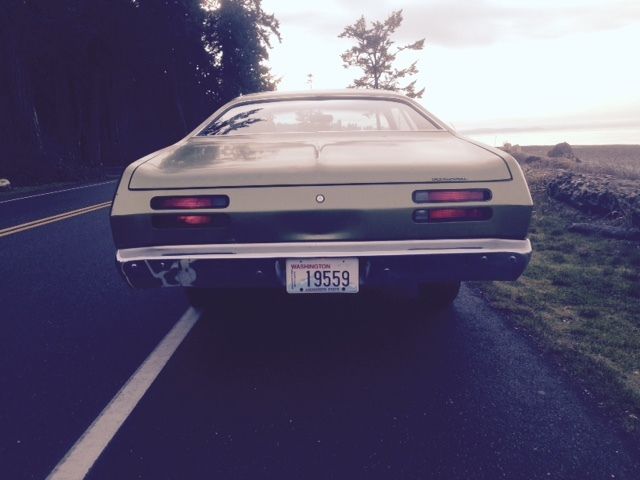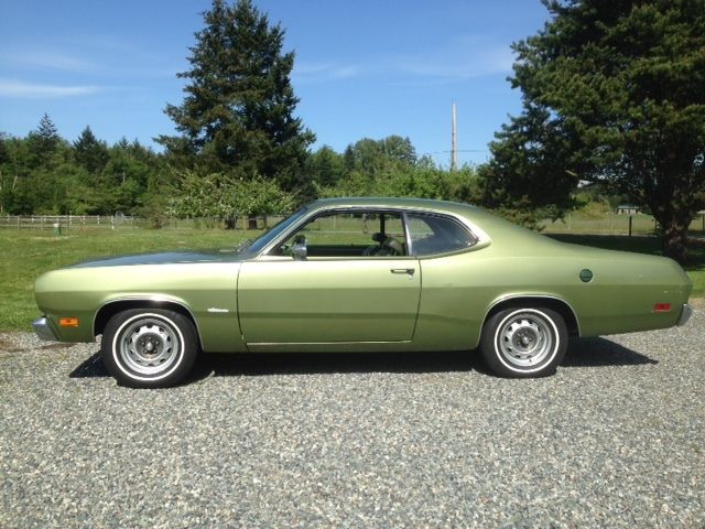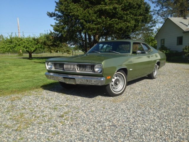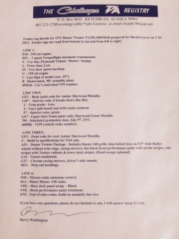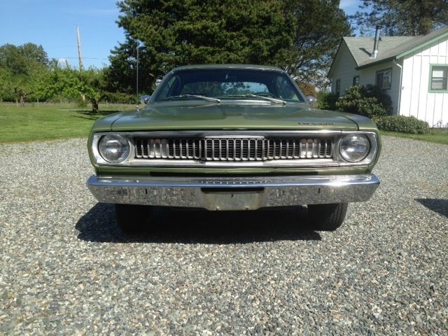 I have owned this Duster Twister for the last 17 years. It was bought new by Mrs. Wellan from Bellevue Washington. She was 51 when she bought it on October 1 1971. She passed away in 1997 and my Father in law and I purchased it from her son in law in 1998. She kept it garages or car ports and I have had it in storage in my pole barn for the last 17 years. Its had one repaint in the mid seventies when there was some damage to the top edge on the drivers side fender and corner of the hood. The shop replaced the drivers side fender and repaired the corner. There is no damage at all to the inner supports. She said she was glad to have it painted as the flat black hood and strips where a bit "sportier" than she liked. It has the original mileage of 37k. It was being driven on the original Goodyear power cushion white wall tires when I bought it. I kept one of them when I changed them over to radials. I have the broadcast sheet that was under the rear seat. I have replaced the intake manifold gaskets ( motor was spotless inside) and points and rebuilt the carb. It runs like it left the factory. The front brakes had leaking wheel cylinders which I replaced with new correct number matching nos pieces. I also replaced the front brake shoes with nos and had the drums turned. The rears are original. It stops perfect. They are power drums. All glass is original to the car and is like new. The windshield is flawless with no rock chips or damage. Headliner is nice just a few small holes. Seats and all the interior is original. Underside of the car has just light surface rust. All suspension parts are original even the shocks. I had the muffler replaced with an nos unit a few years ago. The original alternator I had sent off for refinishing and returned. A paint job and some re-chroming of the sport mirrors and bumpers due to some light pitting is all it need. Very very easy restoration. A51 Twister package B11 HD 10" Drum brakes B51 power brakes C52 Bench seats C93 Carpet D31 A904 Auto D51 2.76:1 E44 318 2 barrel 230 HP G15 Tinted windshield G37 Racing Mirrors G42 Non day/night inside rear view mirror M21 Roof drip moldings M26 Wheel lip moldings N95 Emission controls R11 AM radio 2 watts S77 Power steering V8X Rear panel stripe black V9X Performance hood paint W22 Rally Wheels