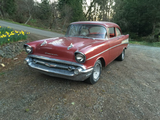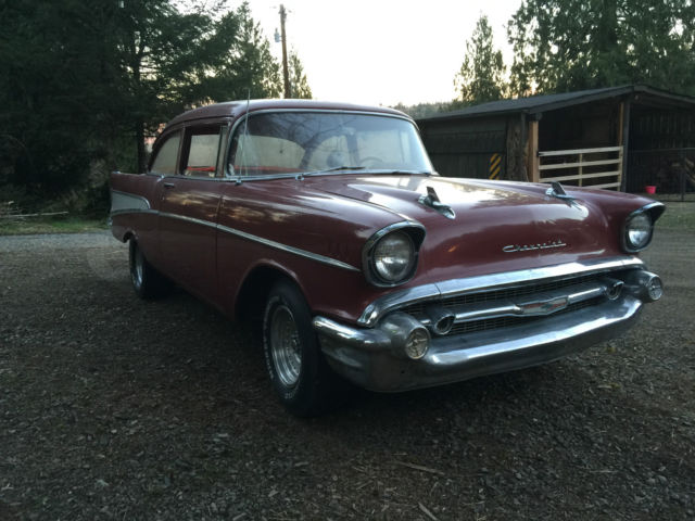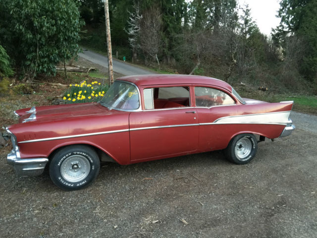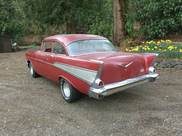 1957 Chevy Bel-Air, 210 Post. Car is in great shape for being 58 years old, she runs, drives, stops and is extremely tight up front. The car has been owned by two others to my knowledge,and both were car lovers. I believe the restoration was done in the early 80's and they did a pretty good job, paint and interior still look nice. There is a small amount of bubbling just behind the drivers door, but you have to get close to see it. The frame, trunk and floors are very solid appearing with no major mentions. New tires,brakes and fuel tank about 5 months ago. She has a 283 sbc, that I believe to be the original motor, it runs good , and is backed by a Saginaw manual tranny on the floor. lights and blinkers work, but the windshield wipers don't. All glass is good with no cracks, and windows roll up and down great. Original heater and fender wells still in place. Hard to find them like this anymore, she's not all cut up, and still looks great. I do have the original wheels and hub caps for her too! Cashiers check or bank transfer only due within 48 hrs of auction close Clean clear Eastern Washington Title, and the car can be delivered within 400 miles for a small fee. Good Luck