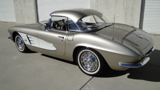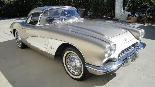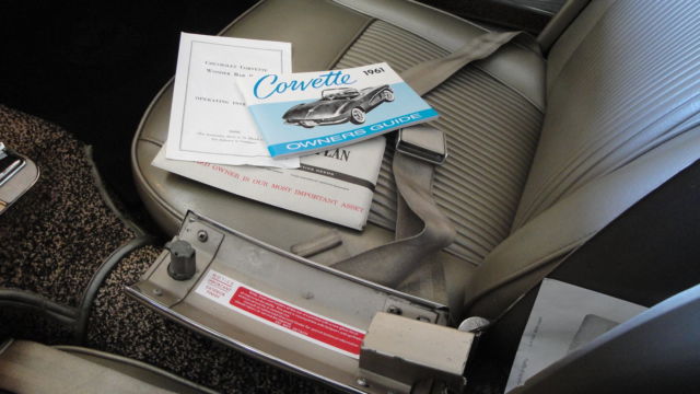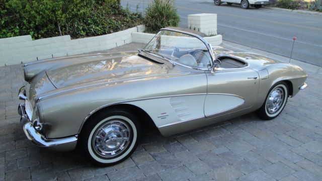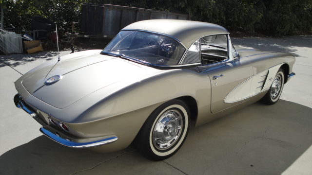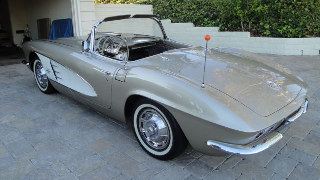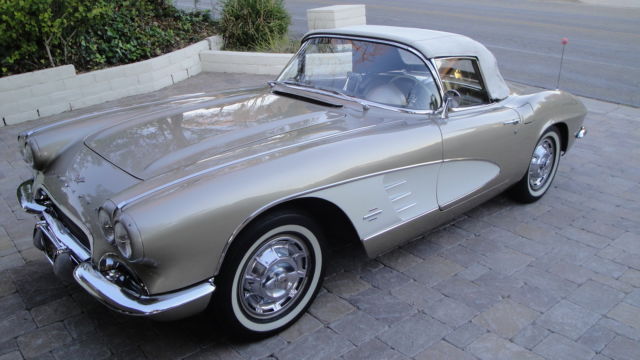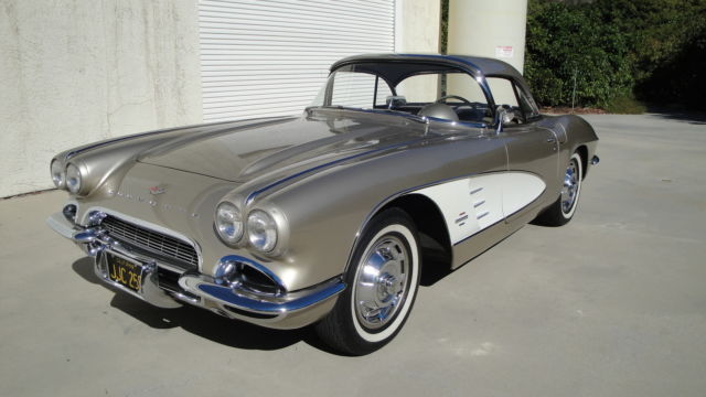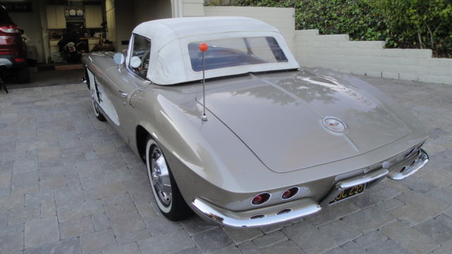 1961 CORVETTE CONVERTIBLE. FAWN BEIGE WITH WHITE COVES AND FAWN BEIGE INTERIOR. THIS IS A BLACK PLATE CALIFORNIA CAR AND WAS FEATURED IN " THE COMPLETE BOOK OF CORVETTE" BY THE AUTO EDITORS OF CONSUMER GUIDE. AUTHOR IS RICHARD M. LANGWORTH. THIS IS A MATCHING NUMBER, NOT A RESTAMP, CAR WITH IT'S ORIGINAL ENGINE AND T-10 BORG WARNER TRANSMISSION AND REAR END. IT HAS BOTH HARD AND SOFT TOPS AND WONDERBAR RADIO, THAT WORKS. PAINT IS OLDER LACQUER PAINT WITH SOME NICKS, CHIPS AND SCRATCHES, BUT LOOKIS GREAT. THE CHROME IS EXCELLENT INCLUDING THE DOOR AND WINDSHIELD POSTS. ALL STAINLESS IS ALSO IN EXCELLENT CONDITION. INTERIOR IS ALL CORRECT WITH VERY NICE ORIGINAL DOOR PANELS, DASH PAD AND SEAT COVERS. CARPET LOOKS GOOD BUT IS OLDER. EVERYTHING WORKS EXCEPT THE CLOCK. THIS CAR RUNS AND DRIVES GREAT. TIRES ARE QUITE OLD BUT RIDES WELL. I JUST REPLACED THE CLUTCH. YOU WOULD BE HARD PRESSED TO FIND SUCH A NICE EXAMPLE. IT ISN'T A TRAILOR QUEEN, BUT A VERY ORIGINAL UNMOLESTED 61. HARDTOP IS VERY NICE AND SOFT TOP IS OLDER WITH A SMALL HOLE IN IT. FOR FURTHER INFORMATION, CONTACT RON AT 805-218-1651. BUYER TO PAY BY BANK WIRE TRANSFER OR CASH. CASHIERS CHECK CAN BE USED BUT THE CAR WILL NOT BE RELEASED UNTIL FUNDS CLEAR. BUYER IS RESPONSABLE FOR SHIPPING. I WILL BE GLAD TO FACILITATE IN THE PROCESS. THIS CAR IS SOLD "AS IS" AND THERE IS NO WARRANTY OR GUARANTEE IMPLIED.