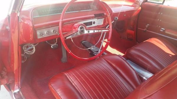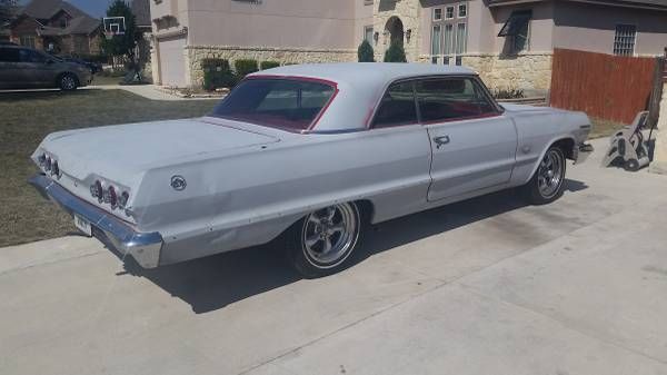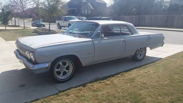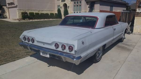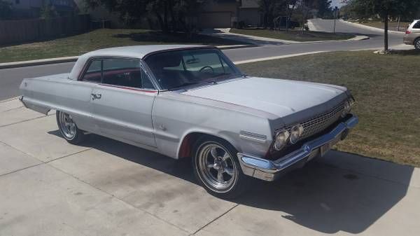 1963 CHEVY IMPALA SUPER SPORT 2 DOOR HARDTOP WITH A REBUILT 355 SMALL BLOCK AND 3 SPEED AUTOMATIC TRANSMISSION. THIS IS A RUNNING AND DRIVING PROJECT WITH COMPLETELY NEW INTERIOR INCLUDING SEATS, HEADLINER, ARMRESTS, KICK PANELS, SAIL PANELS, CARPET. DOOR SILLS, FRONT AND REAR DOOR PANELS ($3500). BRAND NEW EXHAUST SYSTEM INCLUDING MUFFLERS INSTALLED A WEEK AGO. NEW DOOR, TRUNK, GLOVE BOX LOCKS AND KEYS. PURCHASE WILL INCLUDE BRAND NEW FRONT DISC BRAKE CONVERSION KIT WITH NEW MASTER CYLINDER AND POWER BOOSTER THAT WILL NEED INSTALLATION. 17" TORQ THRUST RIMS WITH NEW GOODYEAR TIRES. BRAND NEW SS BADGES ON REAR SIDES. NEW ANTENNA. NEW CHROME POWER STEERING PUMP, ALTERNATOR, INTAKE, CARB, HEADERS, AND WHEEL CYLINDERS. THIS IS A GREAT FIND BUT WILL NEED PAINT AND BODY, OBVIOUSLY. ALL TRIM WILL NEED REPLACING DUE TO DENTS, DINGS, DAMAGE OR SIMPLY JUST MISSING. ALL TRIM AND EXTRA PARTS THAT I DO HAVE, WILL BE INCLUDED IN SALE. SUSPENSION PARTS WILL STILL NEED TO BE UPDATED. THE BODY IS VERY SOLID WITH NO RUST EXCEPT FOR THE 2 FRONT FLOORS THAT WILL NEED TO BE FIXED CORRECTLY. COMPLETE NEW FRONT FLOOR PANS WILL NOT BE REQUIRED FOR REPAIR BUT MIGHT MAKE THE FIX EASIER. THE TRUNK, ROCKERS AND OTHER FLOORS ARE FINE. LIGHTS ARE IN WORKING CONDITION INCLUDING TURN SIGNALS. WINDSHIELD WIPERS ARE MISSING THE MOTOR. FUEL GAUGE IS WORKING. SPEEDOMETER IS IN WORKING CONDITION. ALL GLASS IN GOOD CONDITION WITH NO CRACKS. SMALL TRANSMISSION PAN LEAK. THIS IS PRETTY MUCH EVERYTHING RIGHT AND WRONG WITH THE CAR. PLEASE EMAIL ANY QUESTIONS. THANKS