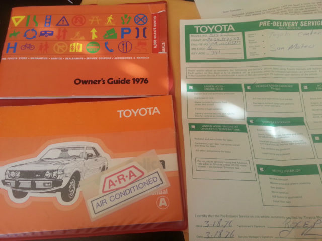 You are looking at 1 Owner Vehicle with all records including original purchase contract, temp title, even the original license plate frames from the dealer survived. It was purchased in San Mateo Ca. in 1976 and garaged since new in California. There are no rust issues at all. All Gauges work, lights, brakes, etc. It has gone through a full inspection at a local Toyota dealer and has passed a very strict Ca. Smog test. Interior is 10 out of 10 for a 39 year old vehicle and the exterior would be 8.5-10, this is and un-restored vehicle, a very nice example of a survivor. Headliner is in great shape, no rips or sagging, seats and door panels have no cracking, rips or tears. All weatherstripping in excellent condition...all rubber seals are soft without any tears nor cracks as well. This car drives smooth, shifter is tight and handling is good....80 MPH on the freeway is smooth without any vibration nor shakes. Brakes are about 80% and clutch feels strong (per records, less than 15k on the clutch). Feel free to ask any questions. Make me an offer...open to reasonable offers, need room soon!!! Original Owner 1976 Toyota Celica GT Coupe 5-Speed manual 20R 2.2 4-Cyl Engine Air Conditioning Heater defrost Manual windows Manual locks Fires up with out issues Original paint Original running gear No rust! Garaged kept California Car No cracks in the glass Turns heads Lots of compliments Female Adult owned Never abused All electric works Radio and Clock works Brown Vinyl Top in perfect condition Clean California title (Original Blue Plates) Additional Pics: photobucket.com/user/exultant1/library (Please copy and paste it on your browser...it has pictures of the trunk and pan which shows clean and free of any rust.) TERMS AND CONDITIONS IF YOU HAVE " ZERO " FEEDBACK YOU MUST CONTACT ME PRIOR PLACING BID OR IT WILL BE REMOVED AND YOU WILL BE BLOCKED FROM MY AUCTION PLEASE HAVE FUNDS AVAILABLE PRIOR BIDDING I WILL NOT WAIT FOR YOU TO GET A LOAN! THIS VEHICLE IS SOLD AS / IS WHERE IS NO WARRANTY I REQUIRE A NON REFUNDABLE DEPOSIT VIA PAYPAL AND REMAINING BALANCE DUE VIA BANK TRANSFER OR MAILED CERTIFIED BANK CHECK VEHICLE IS LOCATED IN San Francisco Ca. I CAN END MY AUCTION EARLY IF YOUR OFFER IS RIGHT