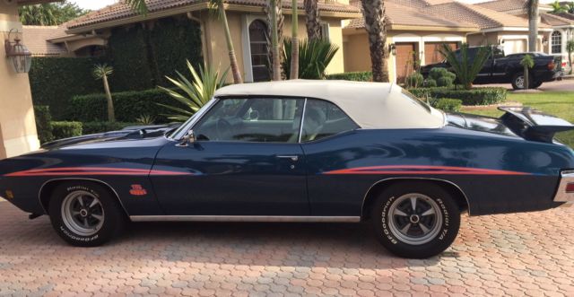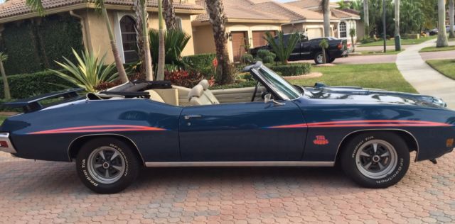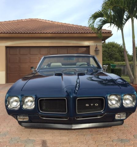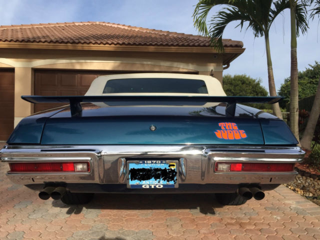 Up for auction is this numbers matching fully documented 1970 GTO Convertible; Currently shown in Atoll Blue with White top and White interior sporting "The Judge" decals and stripes. It was originally Pepper Green with Sandalwood top and Saddle interior. The colors were changed in 2000 / 2001 when the car underwent a frame off restoration at approximately 60K miles. (Restoration performed by second owner) This 3 owner car is one of just 887 1970 GTO convertibles with a 4 speed transmission, the addition of Air conditioning and power windows makes that number much smaller. Car is equipped as follows: 400 CID 4 BBL "W/T" engine code M-21 4 speed transmission "DL" trans code 3.23 Safe-T-Track rear axle Power steering Power disk brakes Power windows Air Conditioning Remote outside drivers mirror (Passenger side view mirror - added) Solar Ray glass Hood mounted Tachometer "The Judge" stripes and decals Rally II wheels (w/o trim rings) BFG Radial T/A tires T-handle shifter Front and rear spoiler PHS Documents as well as the "Car Invoice" from Koplin Pontiac Corp. in Elizabeth, NJ to accompany the sale as well as all receipts for the recent sorting and repairs that make this car a great driver as well as fine piece of automotive history. Car shows very well, no rust or dents, a few minor paint defects. No leaks, everything works as it should. A/C has been upgraded to 134A refrigerant with correct POA valve, expansion valve, barrier hose, and aluminum 10 cylinder compressor. Works great even on the hottest south Florida days. New Petronix III Ignitor and coil, all new A/C Delco secondary ignition components with correct date coded wires. Engine has been tuned on a chassis dyno. All modifications are subtle to ensure reliability with out detracting from the originality. $1000.00 Dollar deposit required within 1 business day of the auction ending. Balance to be paid by cash, certified funds, or wire transfer. Car to be released after bank confirmation of cleared funds. We can assist with shipping and are available for local inspection of the vehicle. Feel free to message me with any questions.
