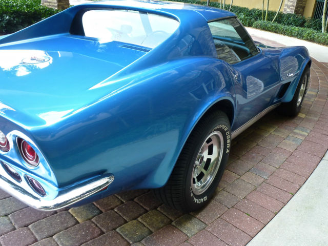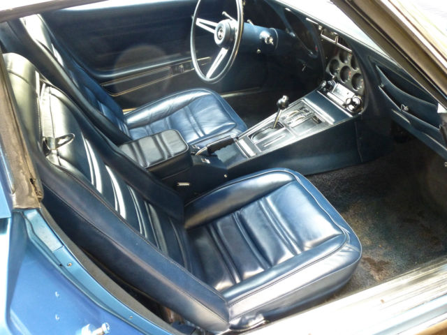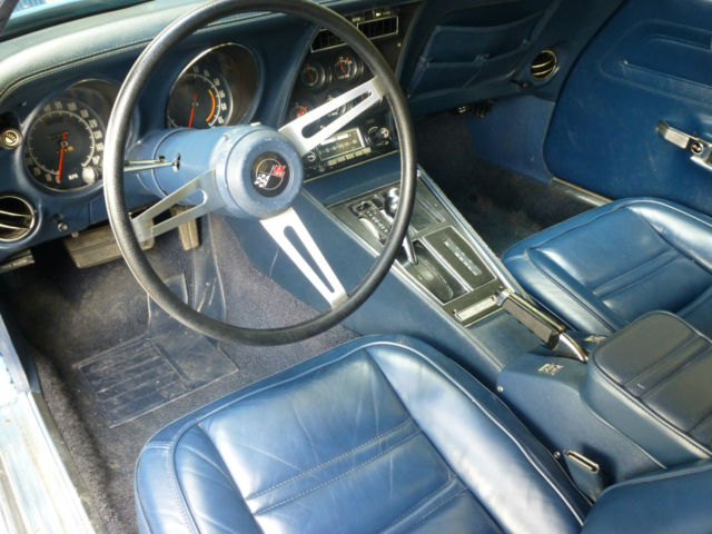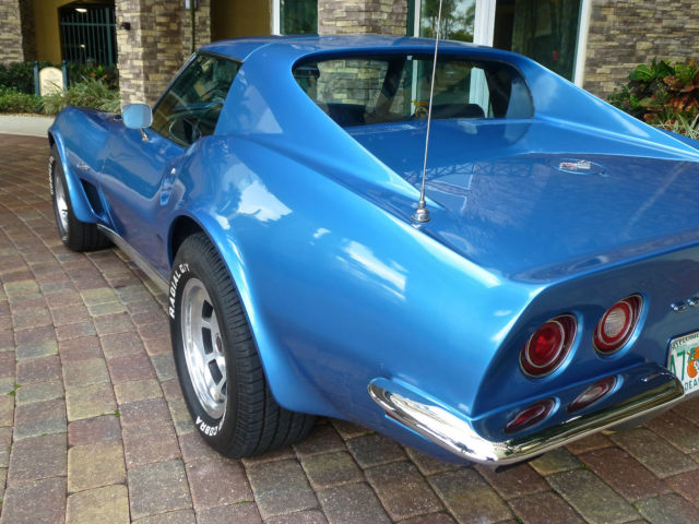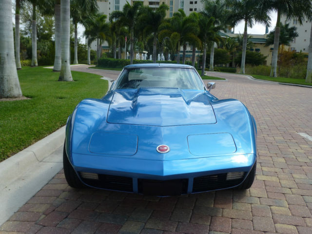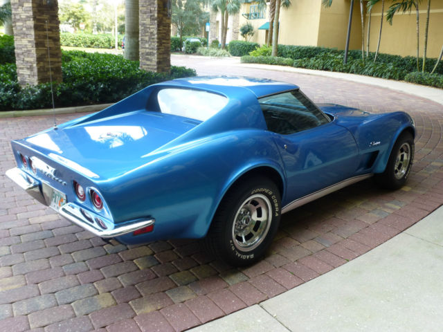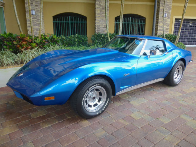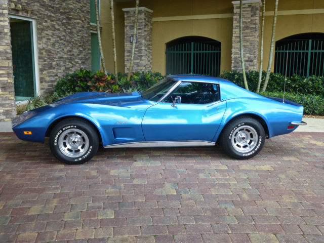 I am listing this car for my computer illiterate buddy who knows his stuff about Corvettes but finds it a struggle to find the on button on a desktop let alone a tablet !!! Below is the story he told me. The car was purchased new by the original owner (a family friend of my buddies) in Ohio in 1973, it is the only year that Corvette has the new Polyurethane impact bumper to the front and the carry over chrome bumpers to the rear. Fitted with T tops, factory air and power windows this is a nicely specified car. 350cu V8 motor, four barrel carb & 3 speed 400 turbo transmission. The owner and his wife then moved to Ft Myers in Florida and became residents when he retired in 1979. The car was put into storage under cover and not touched for 25 years........... My buddy has a restoration shop in Ft Myers and was approached by the friend to get the car running so the old guy could use it. This was a little late as he passed before he could get to drive it again. Listed below is the items replaced: New genuine GM front bumper (the original had simply disintegrated) Rims, tires, brakes, calipers, brake lines, master cylinder, power steering pump, water pump, fuel pump, new gas tank, all new belts and hoses, carb rebuilt and new A/C compressor. The car has its original factory trim, now blows ice cold air and starts and drives plus stops as it should. The paint is not original as the car was painted to the factory color in 1979, it is a 5ft job and although presentable and turns head plus gains a lot of thumbs up it is the main thing that lets the car down, it is what it is. The title is a clear Florida title signed over by the original owner. My name is Roger, feel free to call me on 239 243 4102 I have driven the car taken the photo's and listed it, I however know very little about Corvettes being a Mustang man myself (yes I will now wash my mouth out).